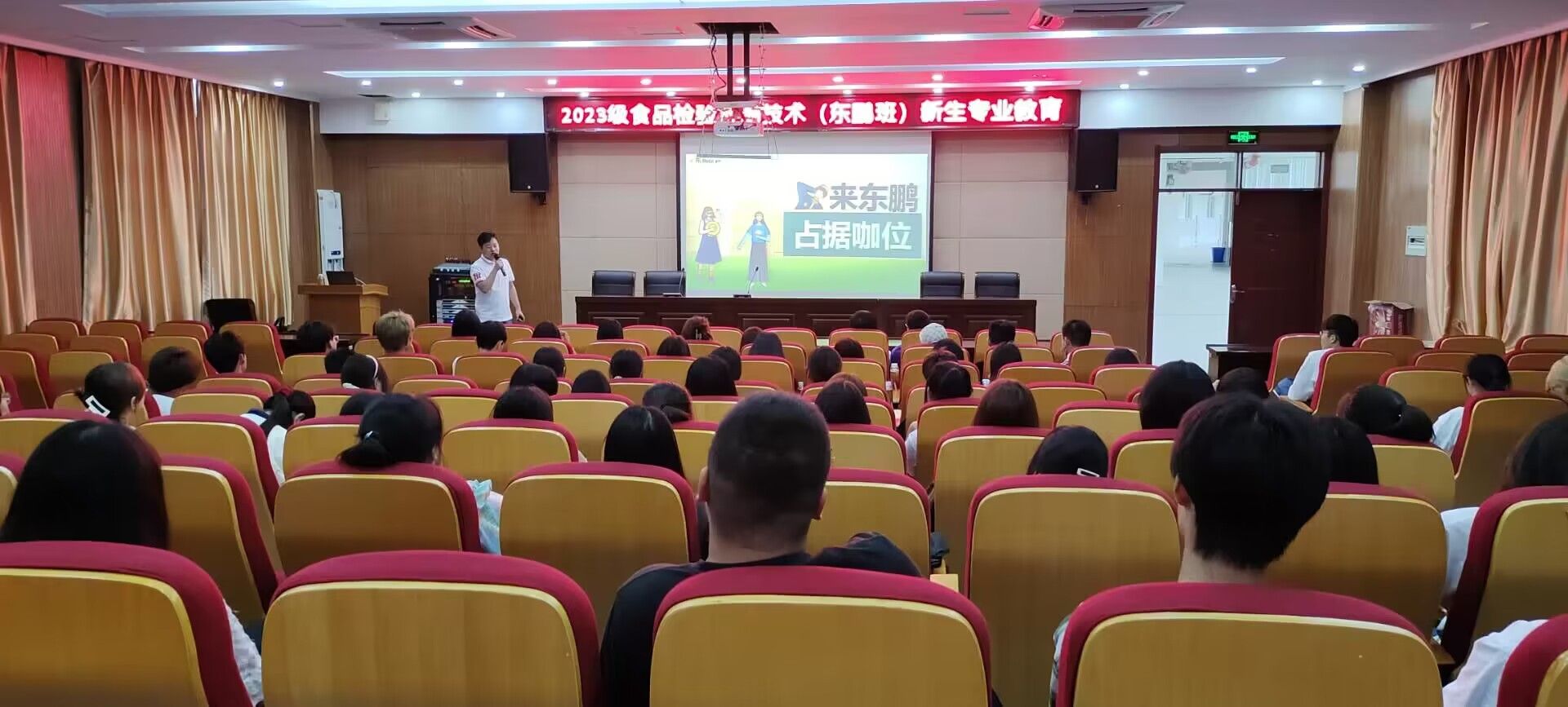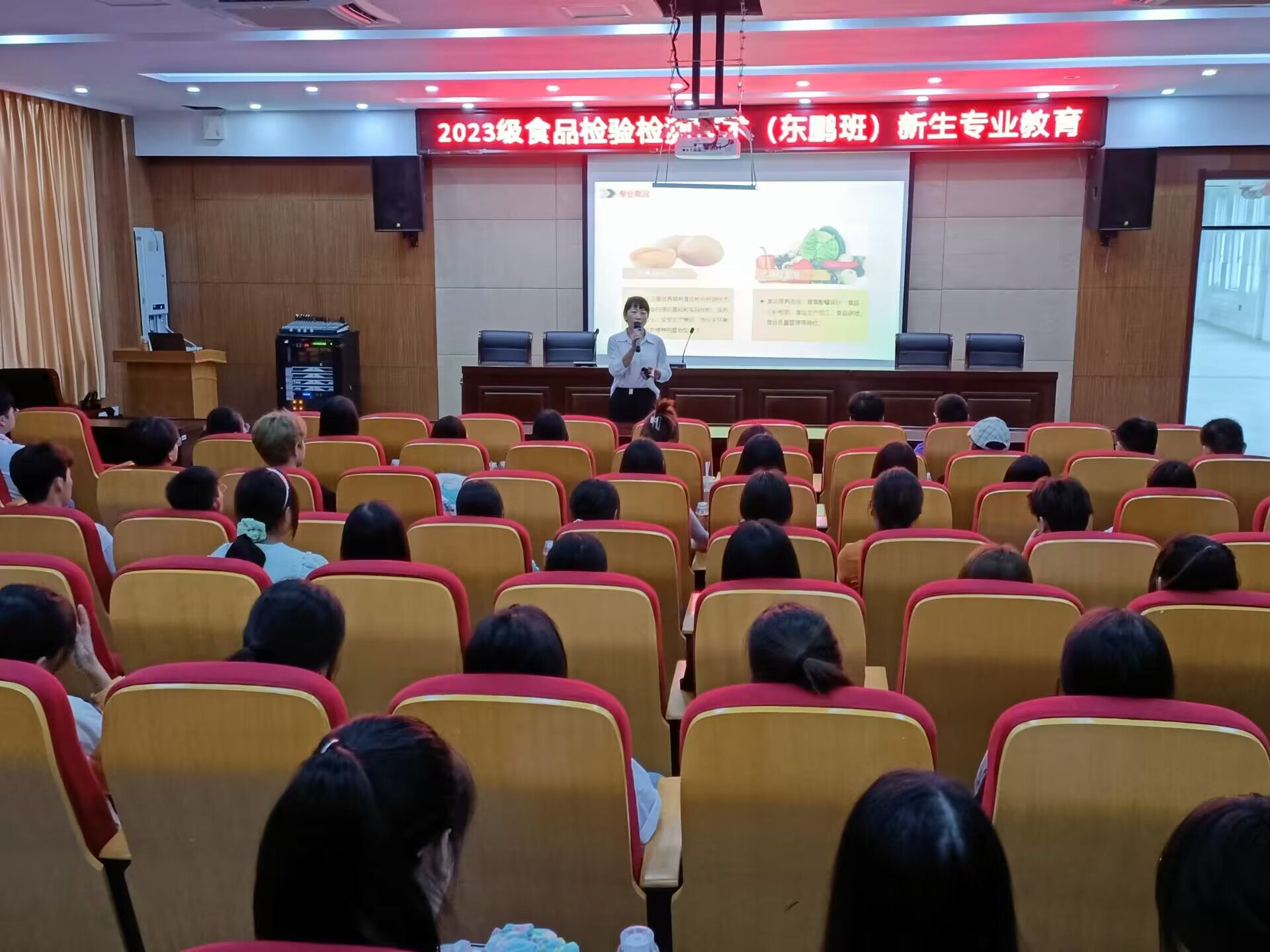2023级食品检验检测技术班(东鹏班)新生专业教育由专业负责人陈静及东鹏公司李小豪主讲。