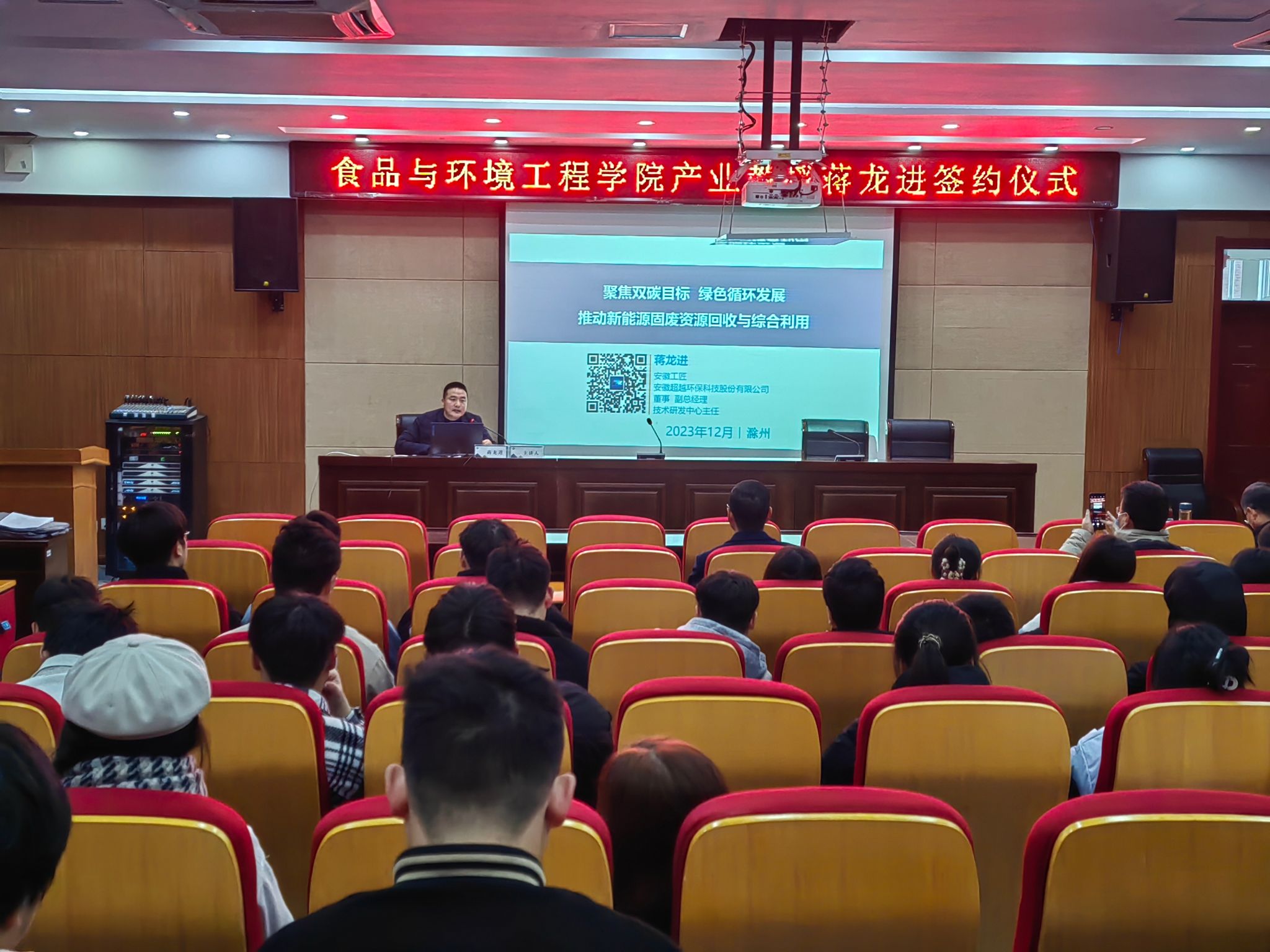 签约仪式之后,由蒋龙进为在场师生做了一场题为《聚焦双碳目标 绿色循环发展推动新能源固废资源回收与综合利用》的专题学术报告,报告结合蒋龙进的工作实际,紧扣行业热点,从政策及行业背景、废旧光伏组件回收利用、废旧风电叶片回收利用、废旧锂电池回收梯次及再生利用四个方面介绍了新能源固废资源回收与综合利用的最新技术和方法。在报告的最后,蒋龙进也结合个人职业发展经历对在场学生提出来就业规划建议,鼓励学生积极通过专升本进一步深造或者在工作岗位上努力提升自己。