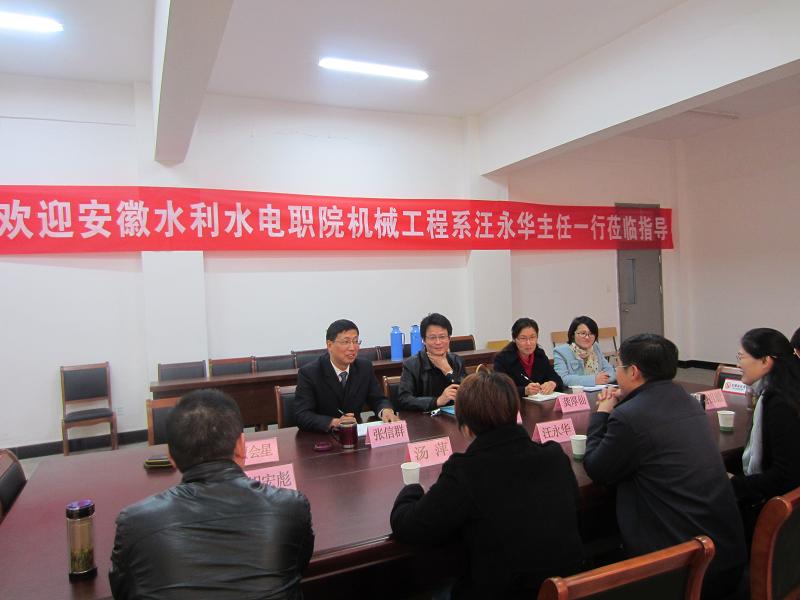 汪永华主任介绍了安徽水利水电职业技术学院机械工程系的基本情况,对新葡的京官网汽车系以较少的教职工能够承担近1400名学生的教学和管理任务表示惊讶和赞赏,对汽车系教职工的工作干劲和奉献精神给与了高度评价。他指出新葡的京集团35222vip的模具专业是央财支持专业,在省内享有较高知名度,该专业建设方案有很好的参考作用,本次来就是要亲身感受一下该专业的软、硬件。双方教师还就模具专业及相关专业的建设和改善实训条件等内容进行了充分的研讨和交流。