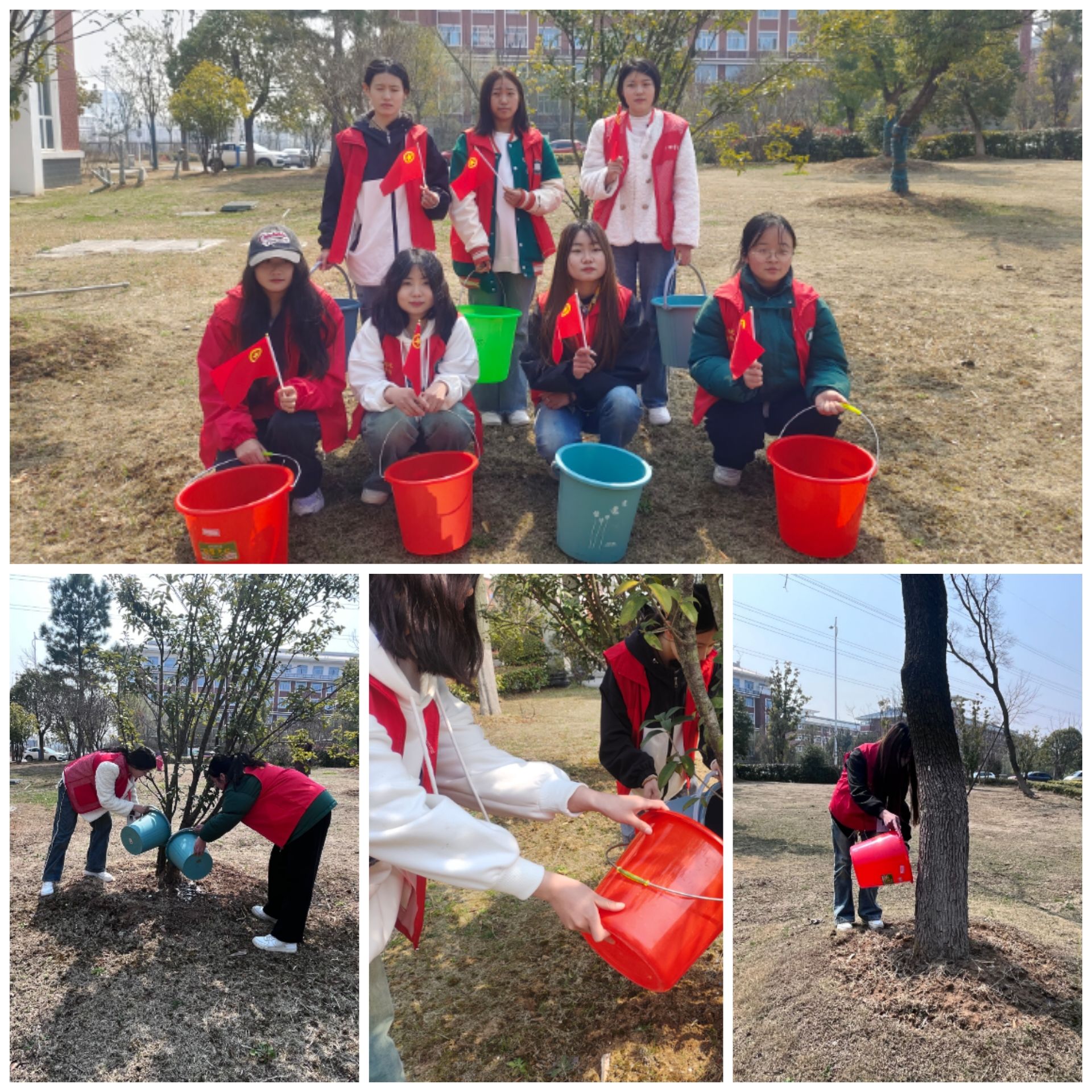 活动现场,学生们纷纷拿起水桶、浇水壶等工具,有序地为小树苗浇水。他们细心地浇灌着每一棵小树苗,仿佛在为它们注入生命的活力。活动现场气氛热烈,大家互相协作,配合默契,共同为这片新绿贡献自己的一份力量。持续一个多小时的公益活动逐渐进入尾声,许多人在自己浇灌除草的树苗上系上美好的祈愿,一张张快乐的合影使植树活动充满欢笑。