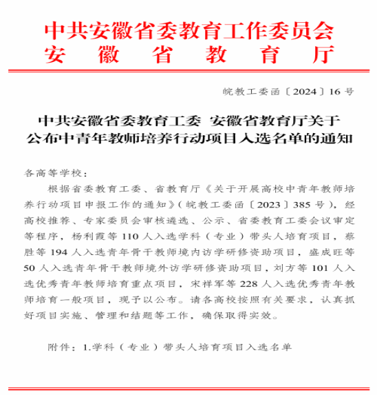 根据《中共安徽省委教育工委 安徽省教育厅关于公布中青年教师培养行动项目入选名单的通知》,2023年度省中青年教师培养行动项目的评审结果正式公布,新葡的京官网财务会计系主任赵进入选学科(专业)带头人培育项目。