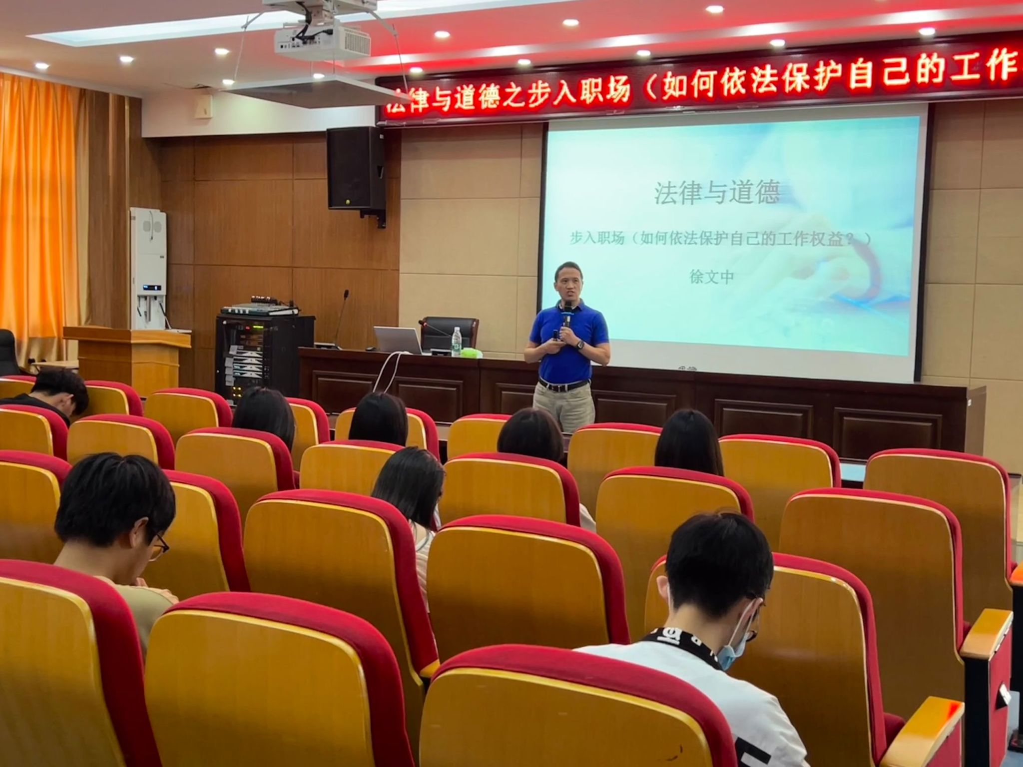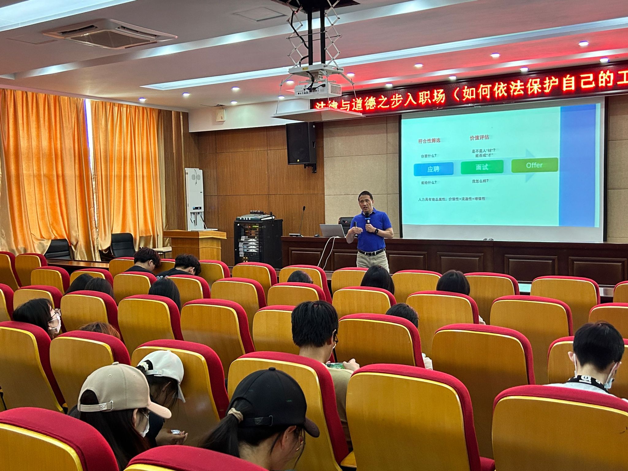 2024年5月29日,管理学院在南阶205教室开展大师进校园活动。新葡的京官网荣幸地邀请到天津财经大学EMBA管理学硕士徐文中老师,为同学们带来“法律与道德之步入职场”的讲座。在讲座中,徐文中大师深入浅出地讲解了劳动法、合同法、知识产权法等职场中常用的法律知识。同时,用生动有趣的案例,以及详实的案例分析,帮助我们的同学们理解了法律与道德在职场中的关系,以及如何运用法律和道德来保护自己的权益和声誉。