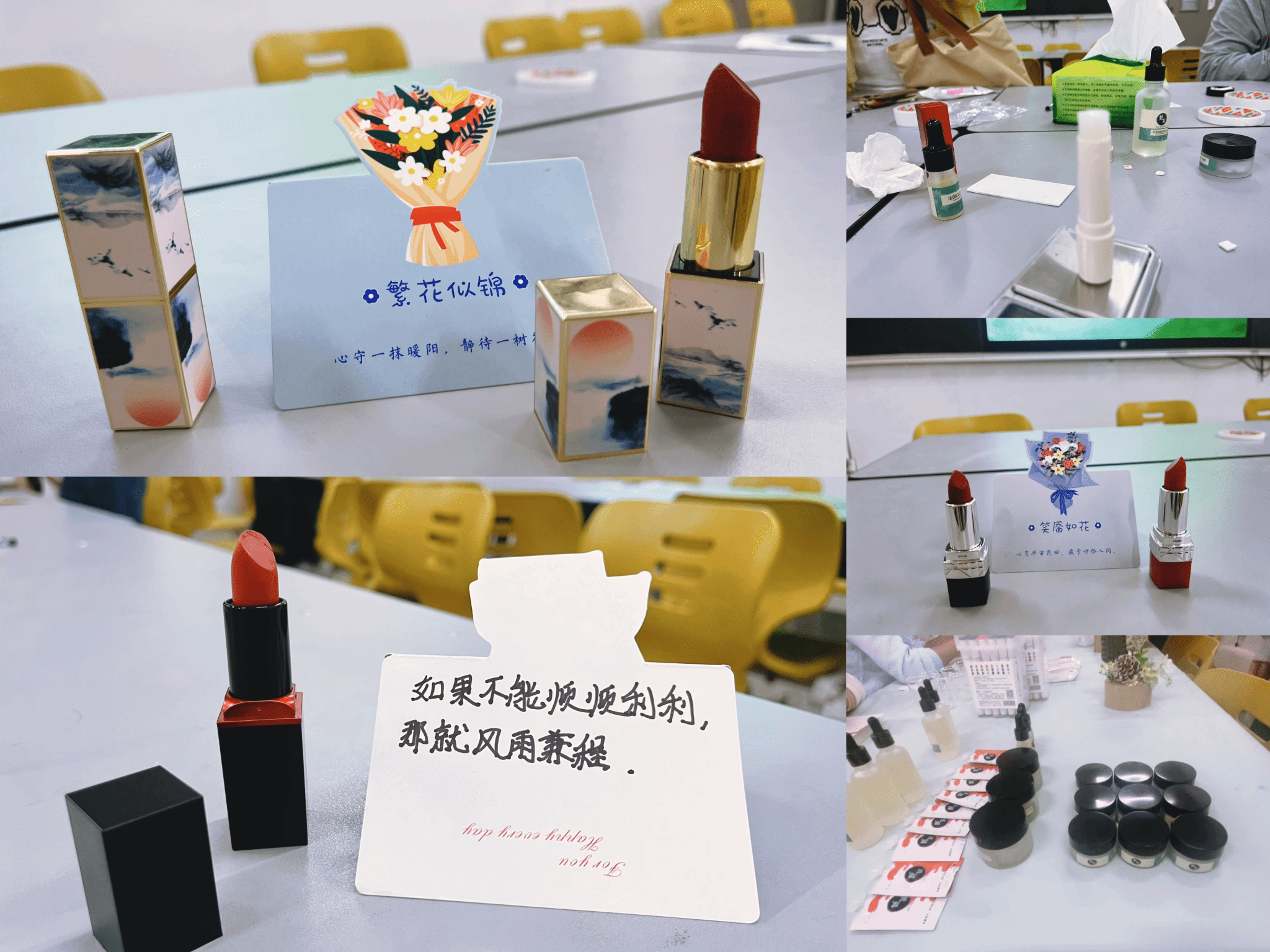 环节二:口红(唇膏)DIY。50位报名学生分成三组,在欢乐愉快的氛围中完成个人创作,并写下祝福贺卡,与自己、他人分享幸福时刻。