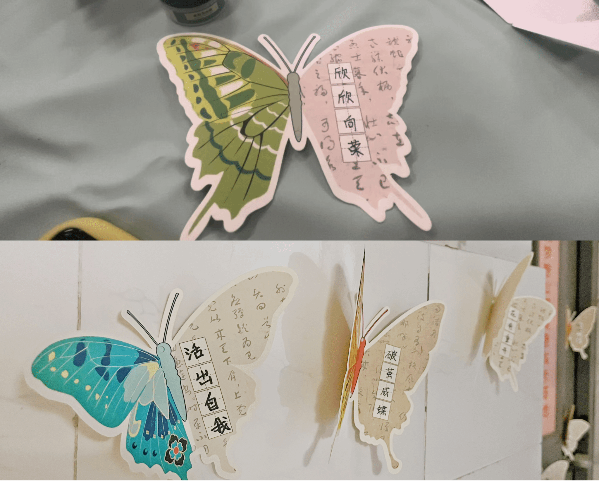 环节三:寄语当下。在蝴蝶造型的便签纸上写下“四字寄语”,如“清风自来”“破茧成蝶”“活出自我”等,充分展示了学生积极向上的乐观心态和正确面对生活的勇气。