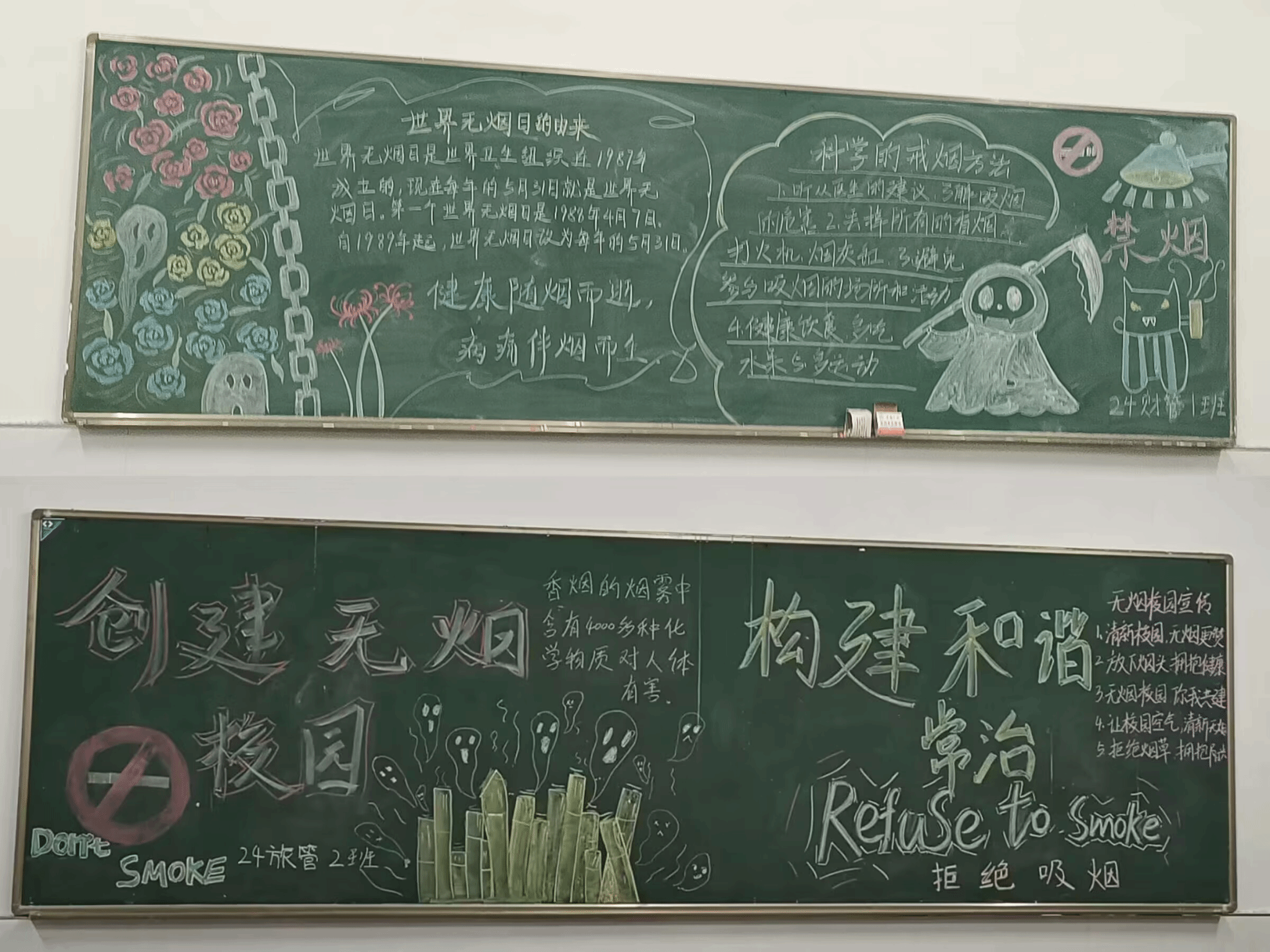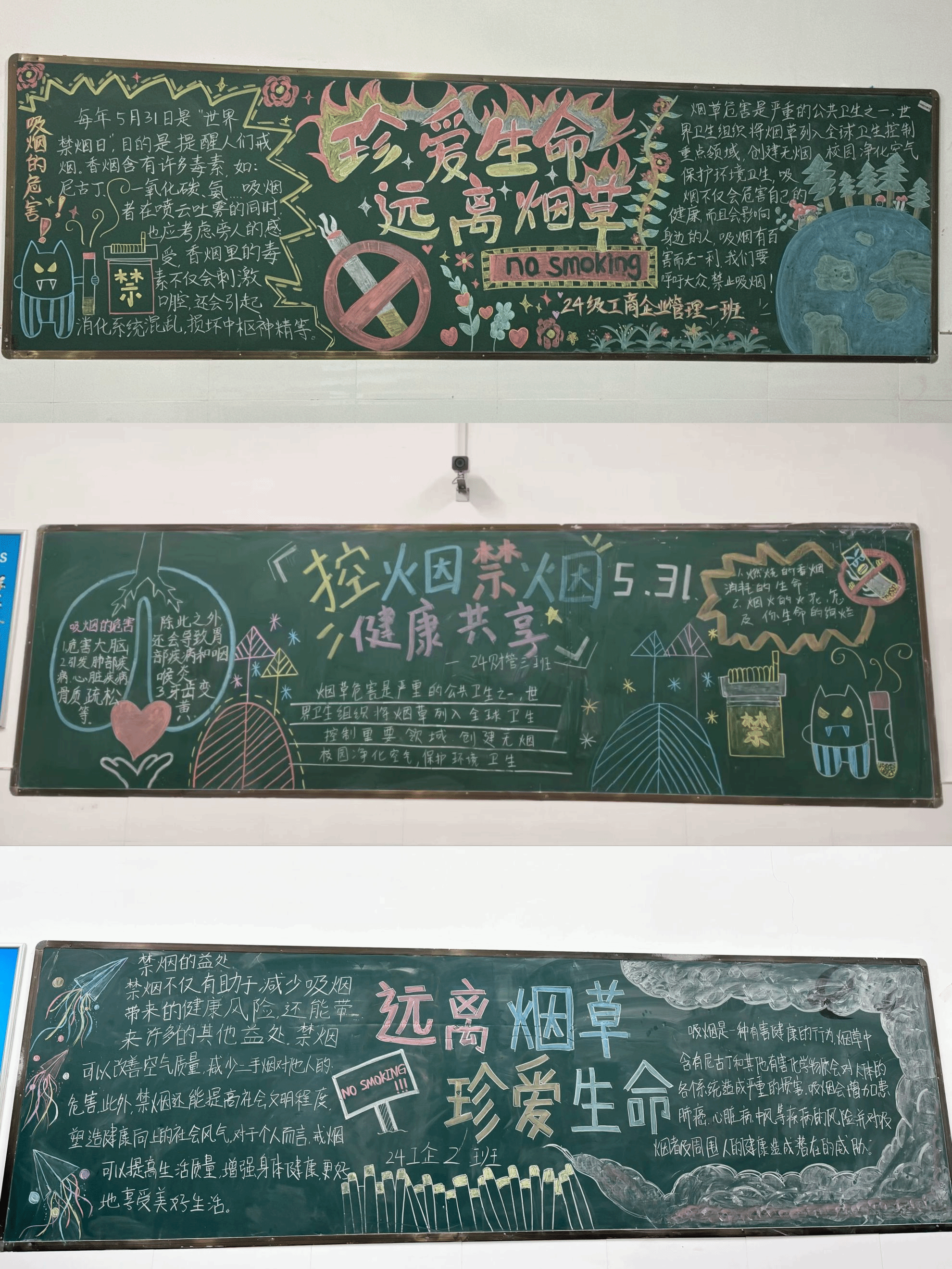 各班级围绕主题踊跃参与,积极创作出一幅幅色彩鲜明、内容丰富、寓意深刻的黑板报。在众多作品中,有的以生动的图画和简洁有力的标语,形象地描绘了吸烟对人体的危害,呼吁大家远离烟草,珍惜生命;有的则以清新的自然风景为背景,配以积极向上的健康小贴士,鼓励大家积极参与体育锻炼,享受健康生活;还有的则通过对比吸烟前后的身体变化,警醒人们关注健康,远离不良习惯。经评比,24级工商企业管理一班荣获一等奖,24级大数据与财务管理三班、24级大数据与财务管理一班荣获二等奖,24级工商企业管理二班、24级旅游管理二班荣获三等奖。