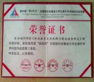 “挑战杯”安徽省大学生课外学术科技作品竞赛是我省重要的,一项以学生为主要参赛群体的科技竞赛。本次比赛以书面投稿的形式,在安徽省各所高校之间进行比稿,我系的这4位同学,深入实践、认真调查,以独特的方式为作品进行创新,经过努力撰稿,他们通过层层选拔,最终脱颖而出,荣获了大赛三等奖的好成绩。