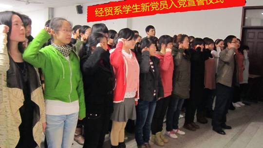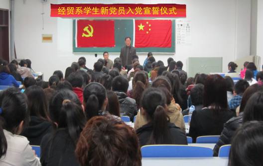 为了进一步深入开展创先争优活动、推进校园文化建设以及充分发挥学生党员在构建和谐校园中的先锋模范带头作用,经贸系党总支于3月28日在一号教学楼1101教室召开了新党员入党宣誓仪大会,经贸系党总支书记李怀成同志,学生党支部书记汪立超老师、组织委员强晓华老师和全体新党员、入党积极分子代表参加了本次大会。会议由经贸系学生党支部组织委员强晓华主持。