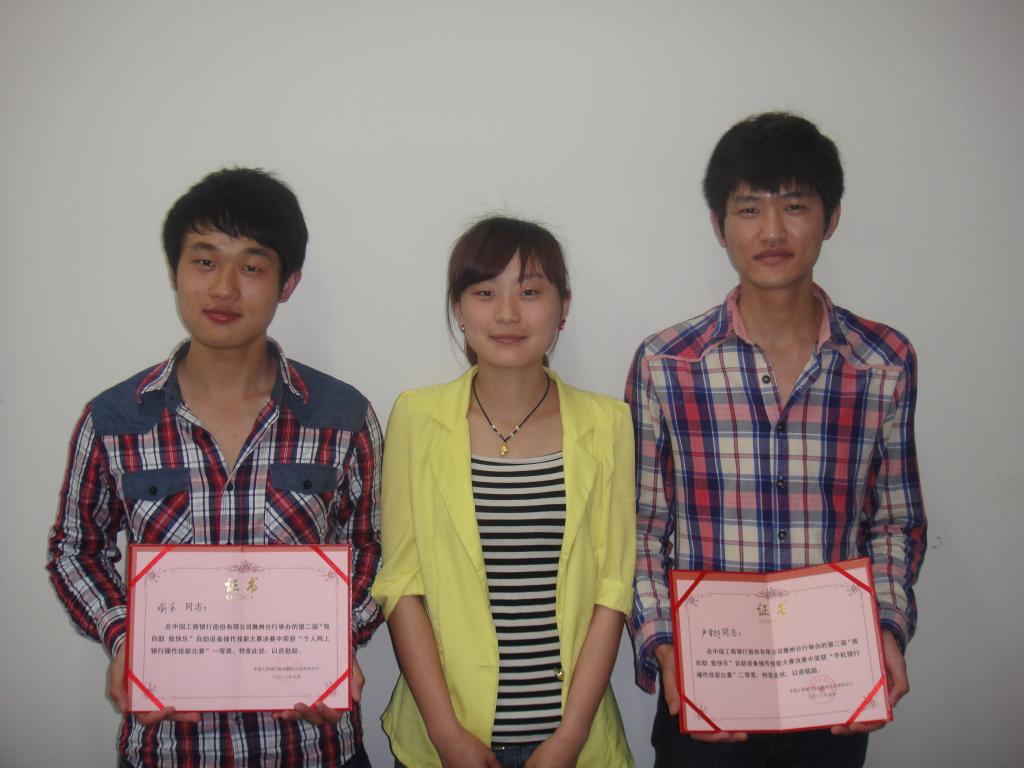 在2013年5月20日举行的中国工商银行滁州分行第二届“我自助、我快乐”自助设备操作技能大赛决赛中,经贸系11级电子商务专业学生喻金、尹学超、余清等三位同学,凭借过硬的心理素质,扎实的技术技能,出色的表现分别获得个人网上银行操作技能比赛一等奖、手机银行操作技能比赛二等奖、优秀奖的优异成绩,并分别获得价值3000元、2000元的奖品。