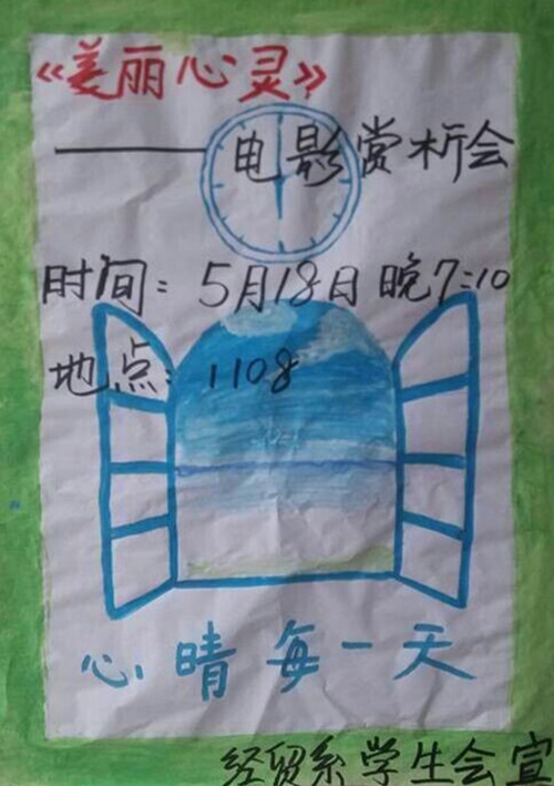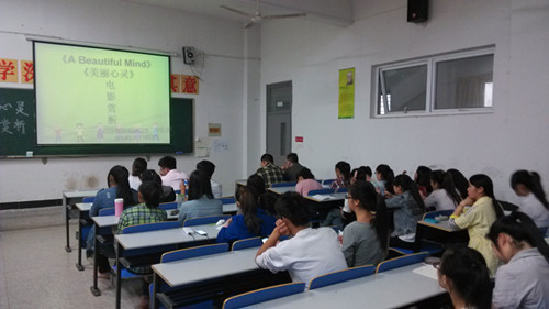 为了使同学们加倍努力学习,同时学会释放自己的心理压力,2014年5月18日晚,经济贸易系团总支、学生会在经贸系教学楼1108教室举办了《美丽心灵》电影赏析活动。
