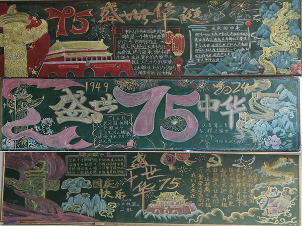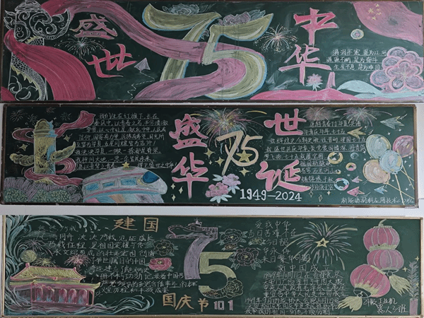 黑板报设计活动同样精彩纷呈。各新生班级充分发挥集体智慧和创意,精心设计了以“庆祝国庆 75 周年”为主题的黑板报。黑板报内容丰富,形式多样,涵盖了国庆的由来、祖国的发展历程、英雄人物事迹等多个方面。色彩鲜艳的画面、生动形象的文字,营造出了浓厚的节日氛围。这些黑板报不仅成为了校园里一道亮丽的风景线,更成为了同学们表达爱国情感的重要载体。