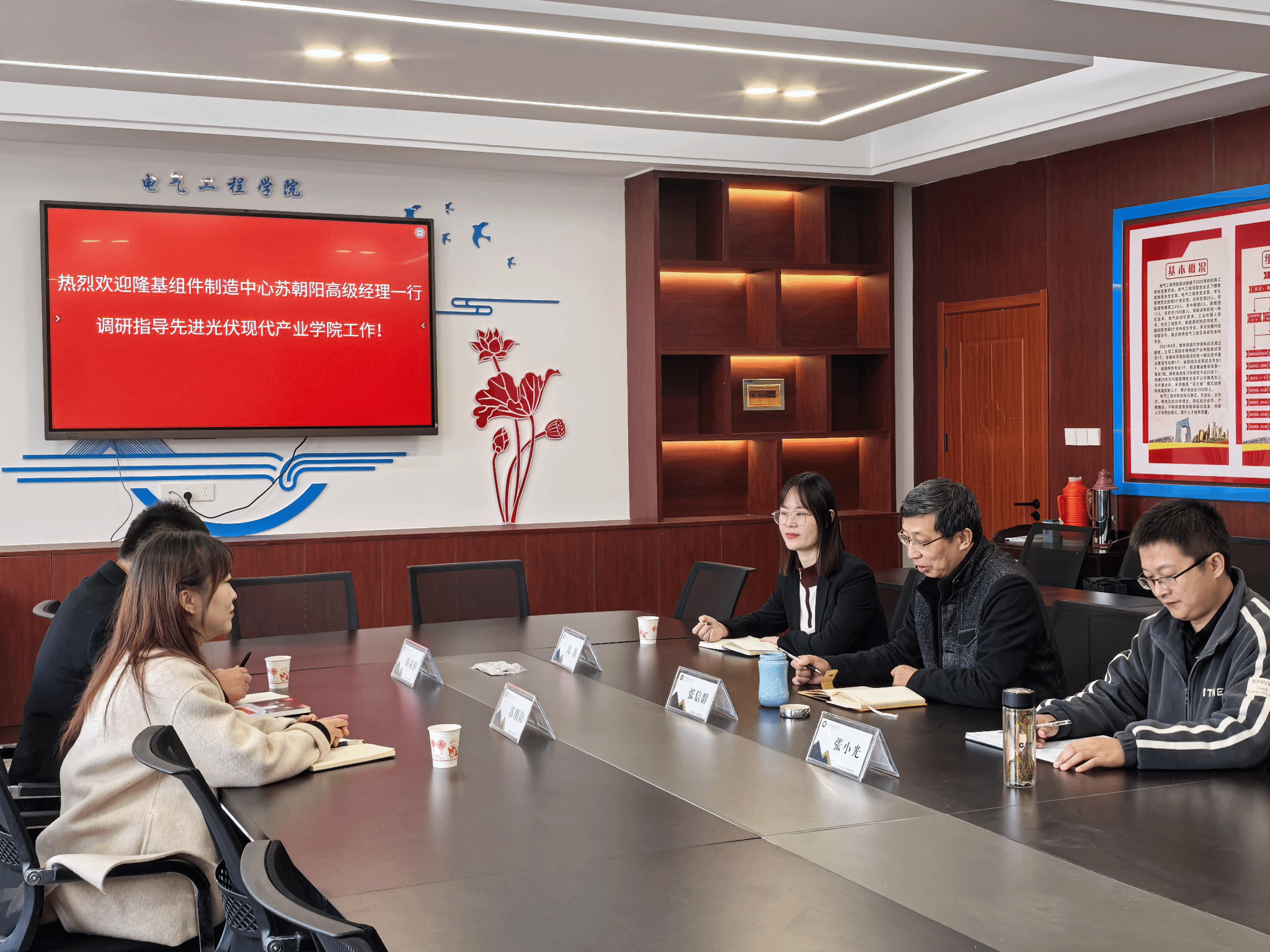12月5日上午,隆基集团组件制造中心高级经理苏朝阳、滁州隆基乐叶光伏科技有限公司人力资源部人才培养经理陈来彬来校调研光伏产业学院工作,电气工程学院院长张信群热情接待了苏朝阳一行。