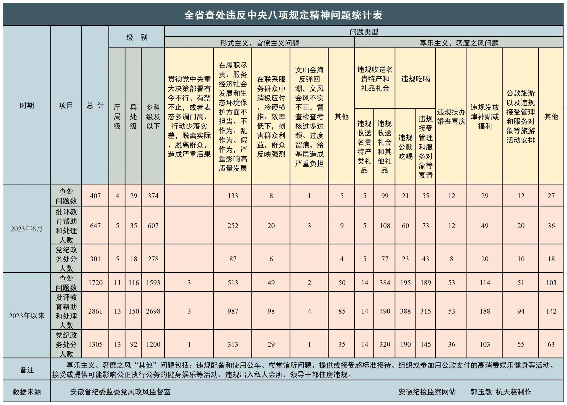 2023年上半年,全省纪检监察机关共查处违反中央八项规定精神问题1720起,批评教育帮助和处理2861人,其中给予党纪政务处分1305人,同比分别上升53.8%、67%、41.2%。