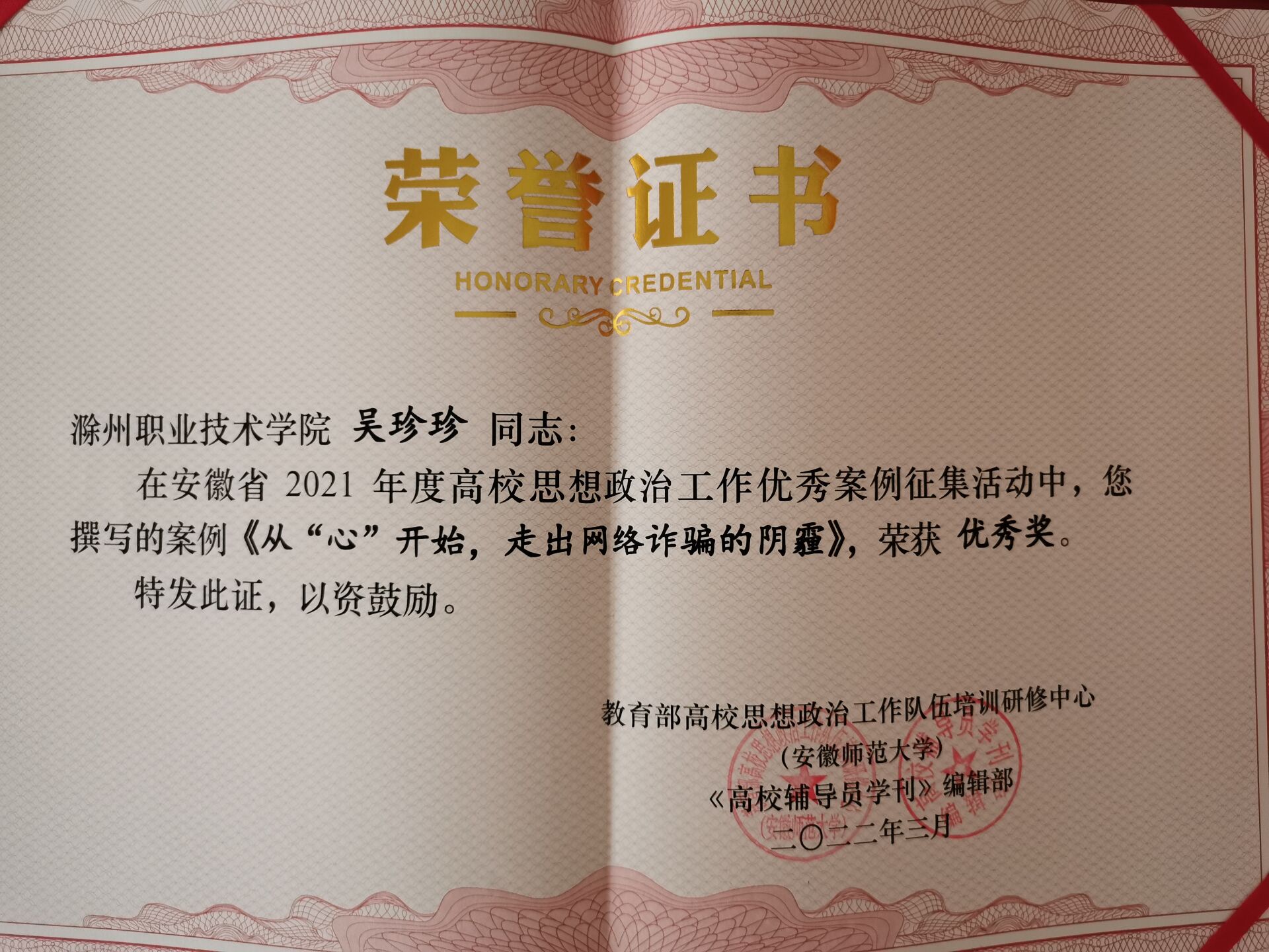 日前,教育部高校思想政治工作队伍培训研修中心(安徽师范大学)组织的安徽省2021年度高校思想政治工作优秀案例征集活动评选结果出炉,管理学院专职辅导员吴珍珍老师撰写的《从“心”开始,走出网络诈骗的阴霾》获优秀奖。