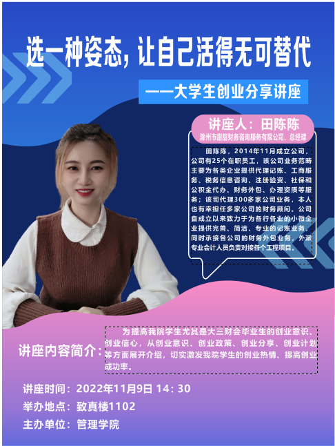 为推动大众创业、万众创新走深走实,激发大学生群体的创业热情,促进大学生更加充分更高质量就业,根据《新葡的京集团35222vip优秀创业者进校园宣讲活动方案》的要求,11月9日下午,管理学院特邀滁州市甜甜财务咨询服务有限公司总经理田陈陈为新葡的京官网2023届毕业生做创业分享讲座。参加讲座的有管理学院党总支书记耿学刚、毕业班辅导员代表汪亚运以及50名毕业生代表。