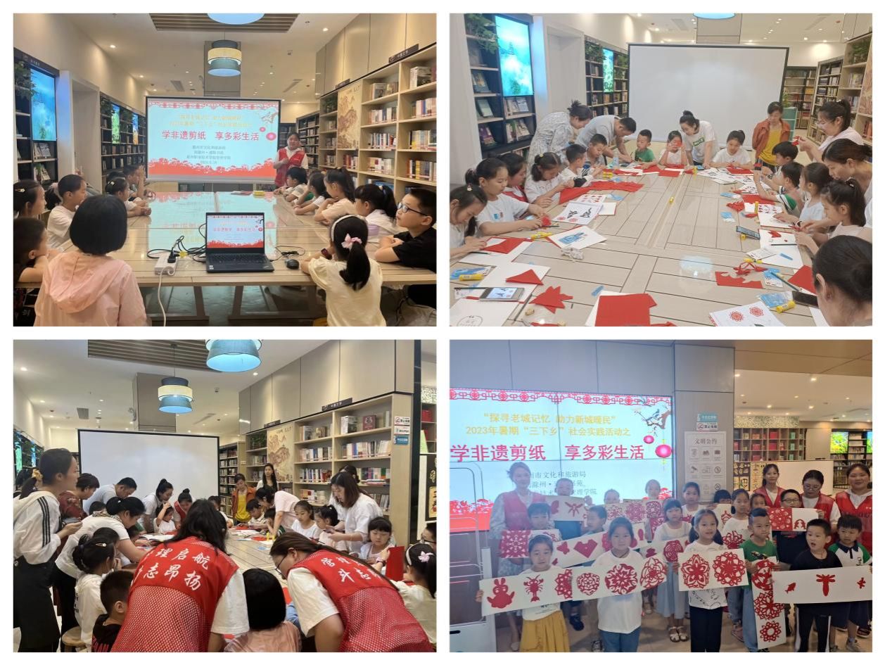 另一组同学们则随活动负责人汪亚运老师来到滁州遵阳书苑开展暖民心安心托幼志愿服务活动,为遵阳书苑招募的16组家庭送去了一堂精彩的非遗剪纸课堂,带领小朋友及家长们“学非遗剪纸 享多彩生活”,并为他们提供了剪纸材料,现场制作剪纸作品,在动手操作中增加小朋友及家长对中国传统艺术的热爱之情。