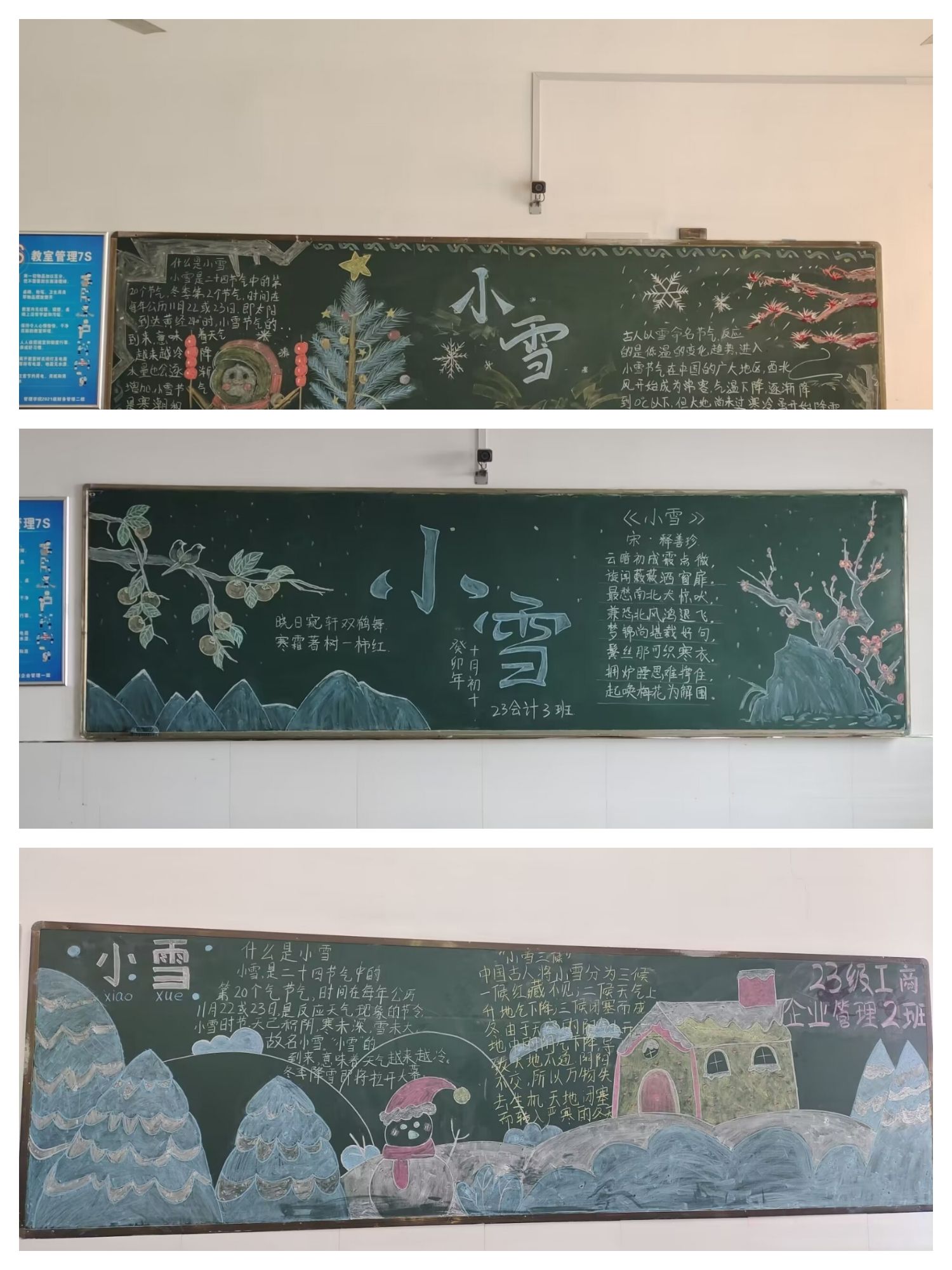 2023年11月21日,新葡的京官网为了迎接“小雪”节气的到来,院学生会开展“小雪到,冬始俏”黑板报活动。