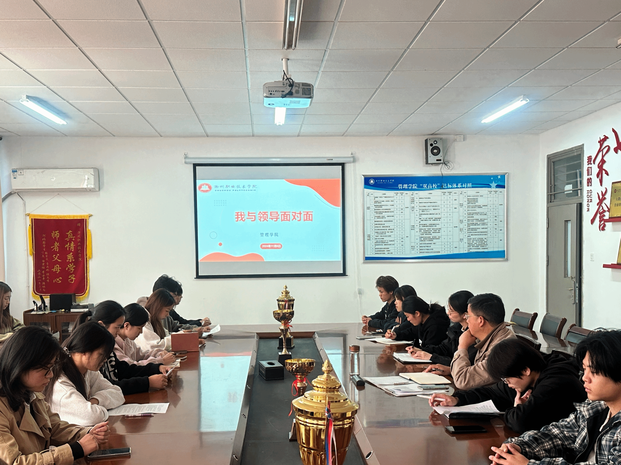 为进一步加强学院领导与学生之间的沟通交流,充分发挥同学们在学校的民主管理和民主建设中的积极作用,维护同学们的合法权益。11月6号下午,管理学院在一号楼院会议室开展“学生与领导面对面”座谈会。管理学院党总支书记耿学刚主持会议并讲话,管理学院团总支书记袁一及学生代表参加座谈会。