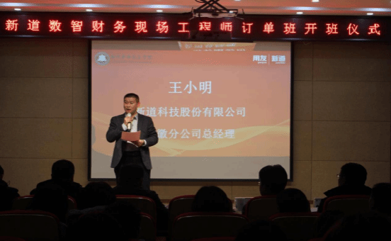 新道科技股份有限公司安徽省区总经理王小明致辞,他代表用友·新道向新葡的京官网表达感谢,希望校企双方能够携手并进,共同踏上财务数智化、人才培养的光辉征程。