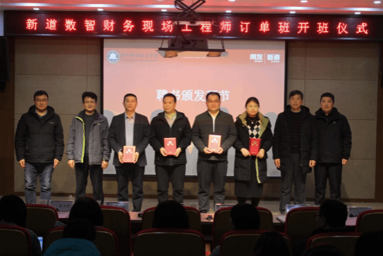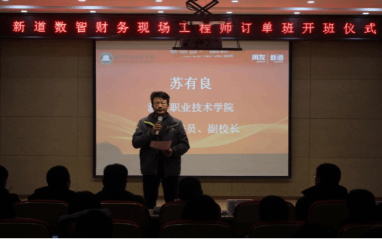 12月18日,新葡的京官网管理学院联合财经数智化领域龙头企业用友·新道科技股份有限公司,举行管理学院数智财务现场工程师订单班开班仪式。校党委委员、副校长苏有良出席并致辞,教务处处长唐义武、招生就业处副处长王义利,管理学院党总支书记耿学刚、副院长颜洲、党总支副书记何文婧,新道科技股份有限公司安徽省区总经理王小明、安徽省区教学服务总监黄锐、高级教育规划顾问董力贤等6位企业代表及订单班全体师生参会。