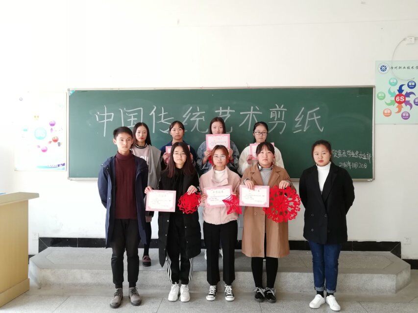 比赛一开始,同学们都全身心投入到剪纸的乐趣中。不一会儿,一张张红纸在同学们的手中变成了各种各样的图案。最终18级旅游管理一班张红娟同学获得一等奖,18级会计六班刘莹莹、18级会计六班代少洁同学获得二等奖,18级会计七班张蓓、18级会计六班魏启琴、18级国贸李雨慧同学获得三等奖。比赛结束后,参赛选手与评委合影留念。