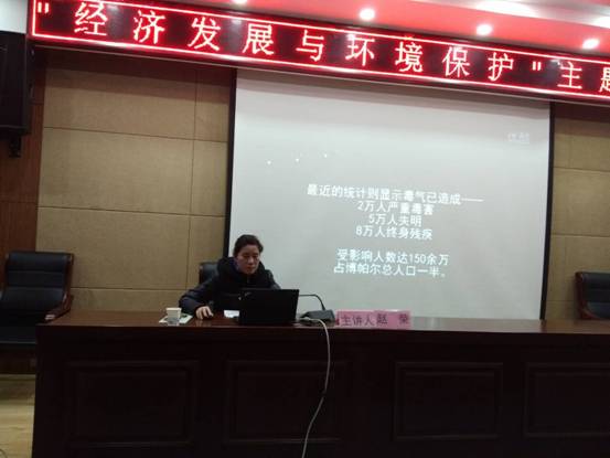大会开始以后,主持人依次介绍了到场嘉宾,致开场词后正式开始,赵荣老师讲座正式开始,老师多次讲到我们要注意环境保护,要经济发展与环境保护统一,讲座最后,赵荣老师放映了视屏,揭示了环境的危害。