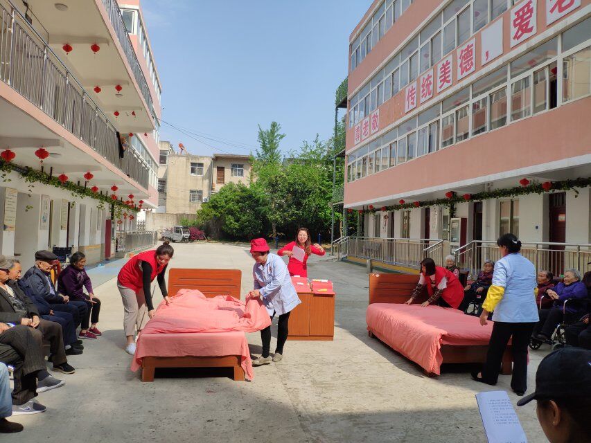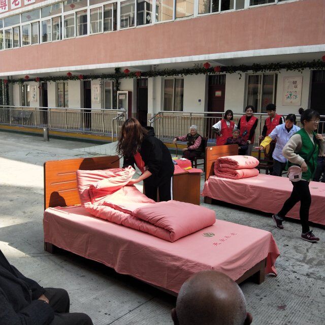 到达敬老院后两个学院的志愿者们首先把床和椅子搬出来供老人们在比赛中使用,接着搀扶老人们下楼进入比赛场地。在比赛开始前志愿者们热情地与老人们交流与老人们唠家常。在主持人的宣布下比赛正式开始——老人们分组进行叠被子比赛,娴熟的动作叠出方方正正的被子,赢得了在场人们的阵阵掌声。比赛结束后由院长和志愿者给老人们颁发奖状与奖品,活动在一片欢声笑语中结束了。