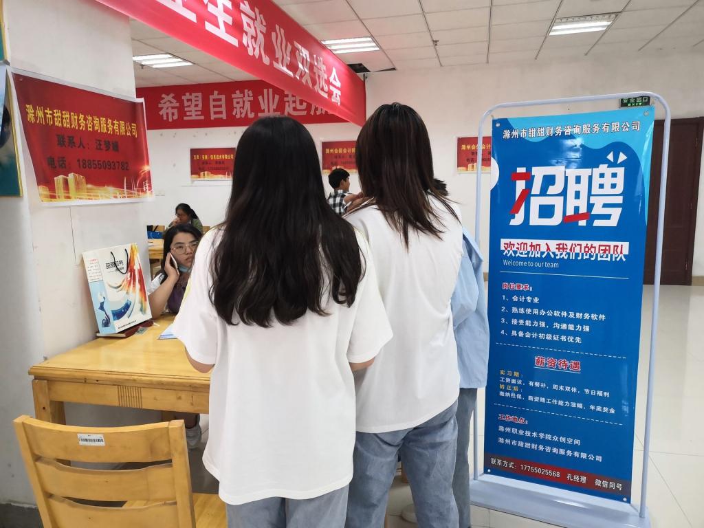 双选会正式开始前,各大企业已经陆续到位,在相应的场地做好了招聘前的准备工作。来自会计、投资理财、工商企业管理、旅游管理等专业的近500名同学分批进入就业大厅,根据自己的就业需求找到相应的企业了解企业用人情况。其中招聘会计岗位较多的有滁州市甜甜财务咨询有限公司,会信会计师事务所。参加校园双选会是同学们走出校门、走上社会的第一步,也是毕业生从学生转换成职场人的必经之路。现场的氛围既紧张又活泼,有的同学初次见识到这场面,略显紧张;也有的同学目标明确,准备充分,很快就寻找到心仪的企业,并企业作进一步的沟通,为自己的未来而谋划。