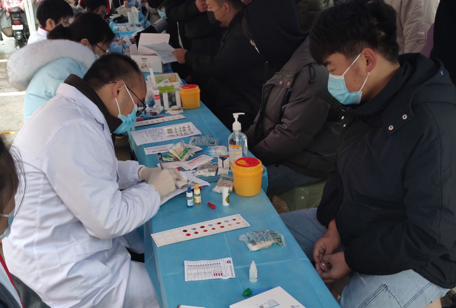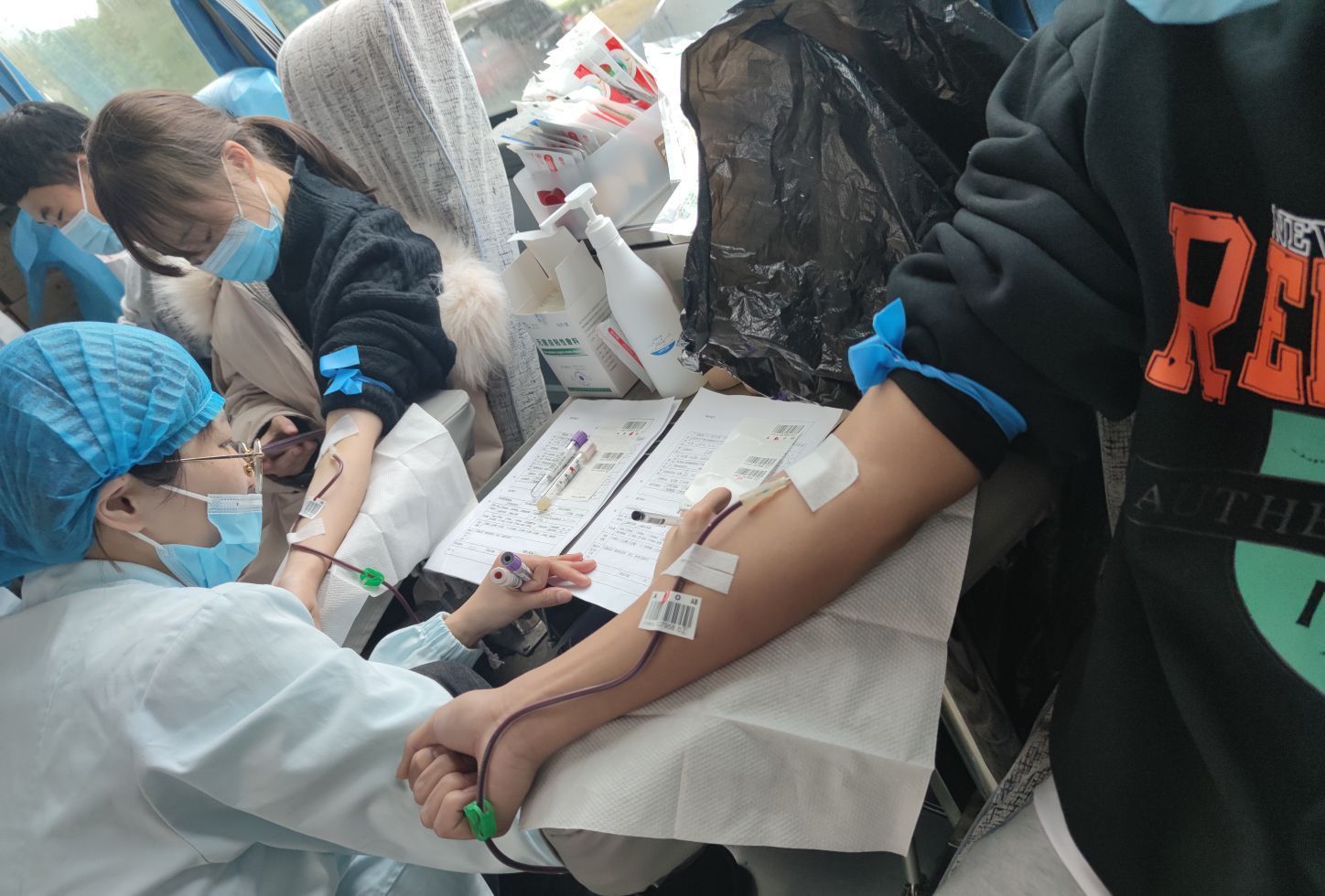 活动过程中同学们严格按照工作人的指导按顺序进行了领表登记、侧血压、血型测定、抽血和观察休息,在工作人员的讲解和鼓励下,奉献爱心的同学们每人献出了200ml或400ml鲜血,而且完成献血的同学们可以领取献血证,学校还特别准备了“爱心大礼包”,里面有牛奶、饼干、面包等营养补给品。整个过程中井然有序体现出新葡的京官网学生积极配合、热情参与的精神。尽管冬季的天气很寒冷,但是他们用热情淹没了瑟瑟寒风,让人在这寒冷的冬季也能感受到暖意。
