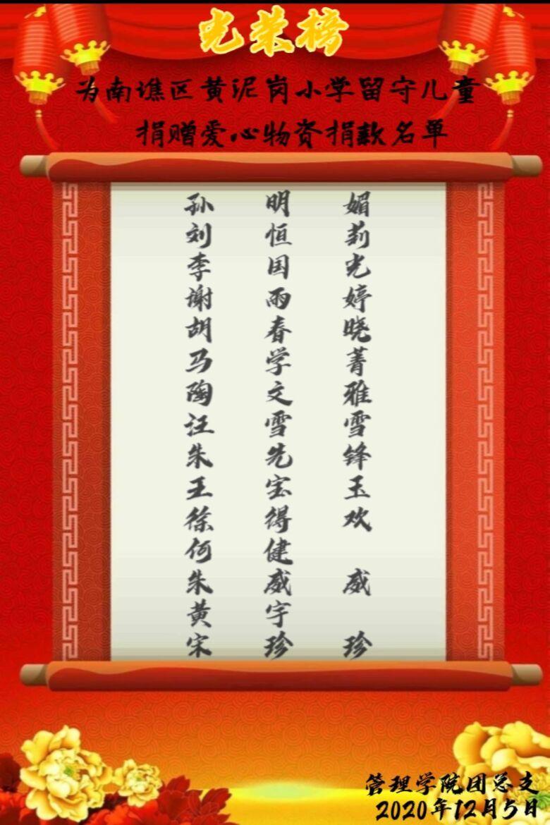 管理学院团总支于2020年12月3日在线上举行“为南谯区黄泥岗小学留守儿童捐赠”的活动,此次活动由团总支全体成员参加。
