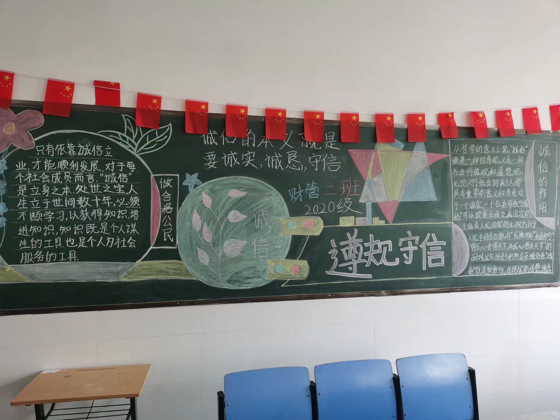 此次活动用制作黑板报的形式,让同学们积极参与到诚信知识的宣传队伍中来,以此增强同学们的诚信意识、金融意识、征信知识以及普及助学贷款办法和国家助学等方面的知识,层层落实。建立活动群,在群里通知相关信息以及活动规则和截止时间最终由学生会评委评议的获奖班级如下:荣获一等奖的班级是20会计(6)班;荣获二等奖有以下班级:20旅管(2)班、20会计(4)班;荣获三等奖有以下班级:20会计(7)班、20工企(1)班、20财管(2)班。