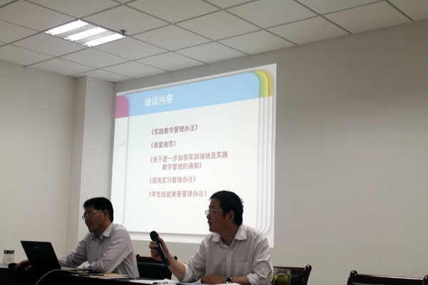 培训的内容为近一年来学院出台或修订的实践教学管理制度,包括《实践教学管理办法》、《课堂规范》、《顶岗实习管理办法》和《学生技能竞赛管理办法》等。