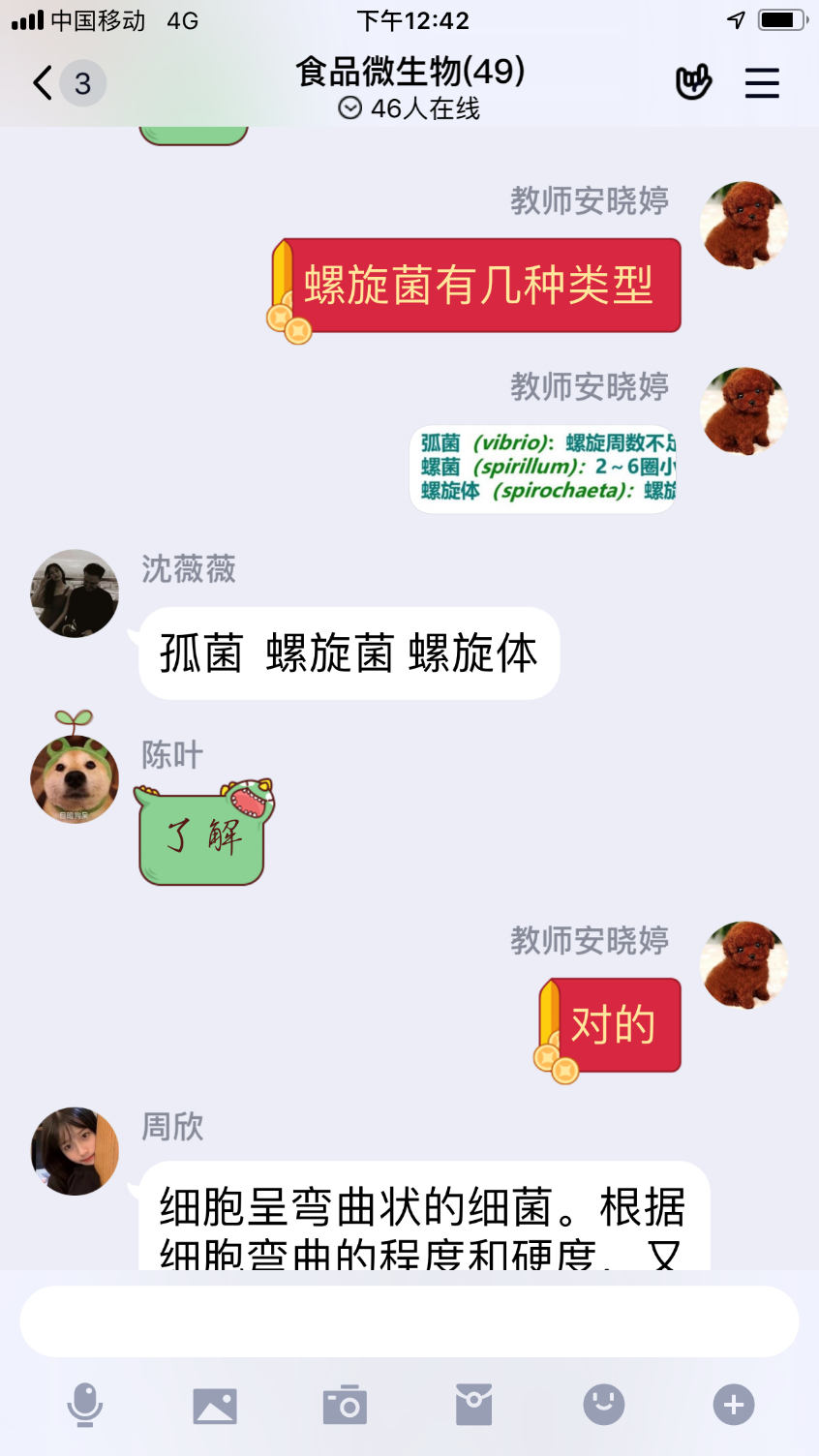 我会让同学们打开我在群里发的ppt,用语音讲解本节课学习的主要内容,接着带着大家看中国大学慕课上已选好的精品课程,看完一个知识点大概10分钟,我会在群里提问,很多同学都积极回答,我还会提一些引申的问题,让同学们自己查找资料(比如讲微生物发展历史,我会让同学们查找青霉素的发现过程),我会在群里给大家回复,进行大概10分钟的交流讨论,接着我还会让大家打开ppt,我用语音或者腾讯会议直播继续讲解这个知识点,加深同学们的理解,达到巩固的效果。