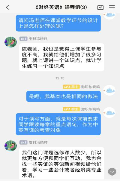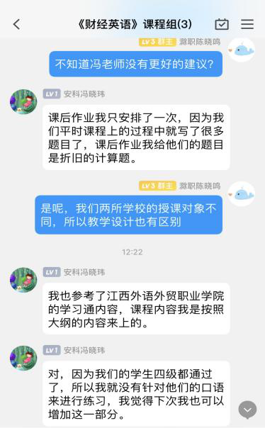 两位老师从课程标准、教材、教学内容、教学重点、教学难点、教学资源、教学过程、练习安排、作业设计、考核等方面进行沟通与交流,利用学习通平台资源,充分调动学生的学习积极性和主动性。
