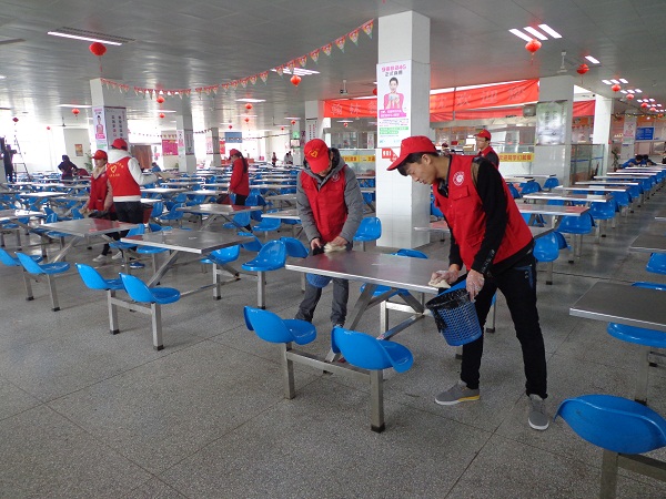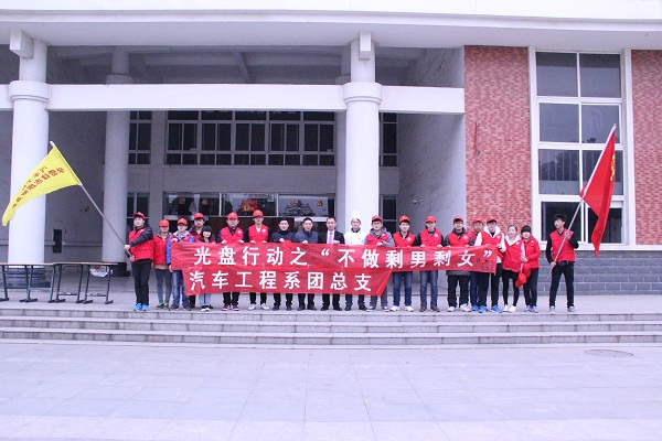 针对食堂饮食浪费比较严重的情况,汽车系团总支在老食堂北门首先进行“光盘行动  不做剩男剩女”签字仪式,签字仪式结束后十八名志愿者分组对三层楼的食堂进行清扫工作,擦桌子、收盘子、打扫卫生、劝导有浪费行为的学生。大家分工明确,与食堂工作人员积极配合,将食堂打扫的整齐干净。活动最后,食堂三楼的大堂经理与志愿者合影留念,同时将大家签字的横幅悬挂到老食堂一楼显眼处,让大家时刻意识到“光盘”精神。