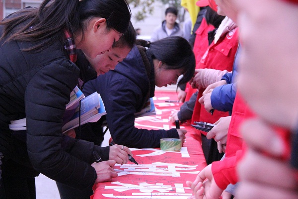 2014年3月7号中午,由汽车系团总支组织的“光盘行动  不做剩男剩女”学雷锋志愿活动在学院老食堂北门开展。