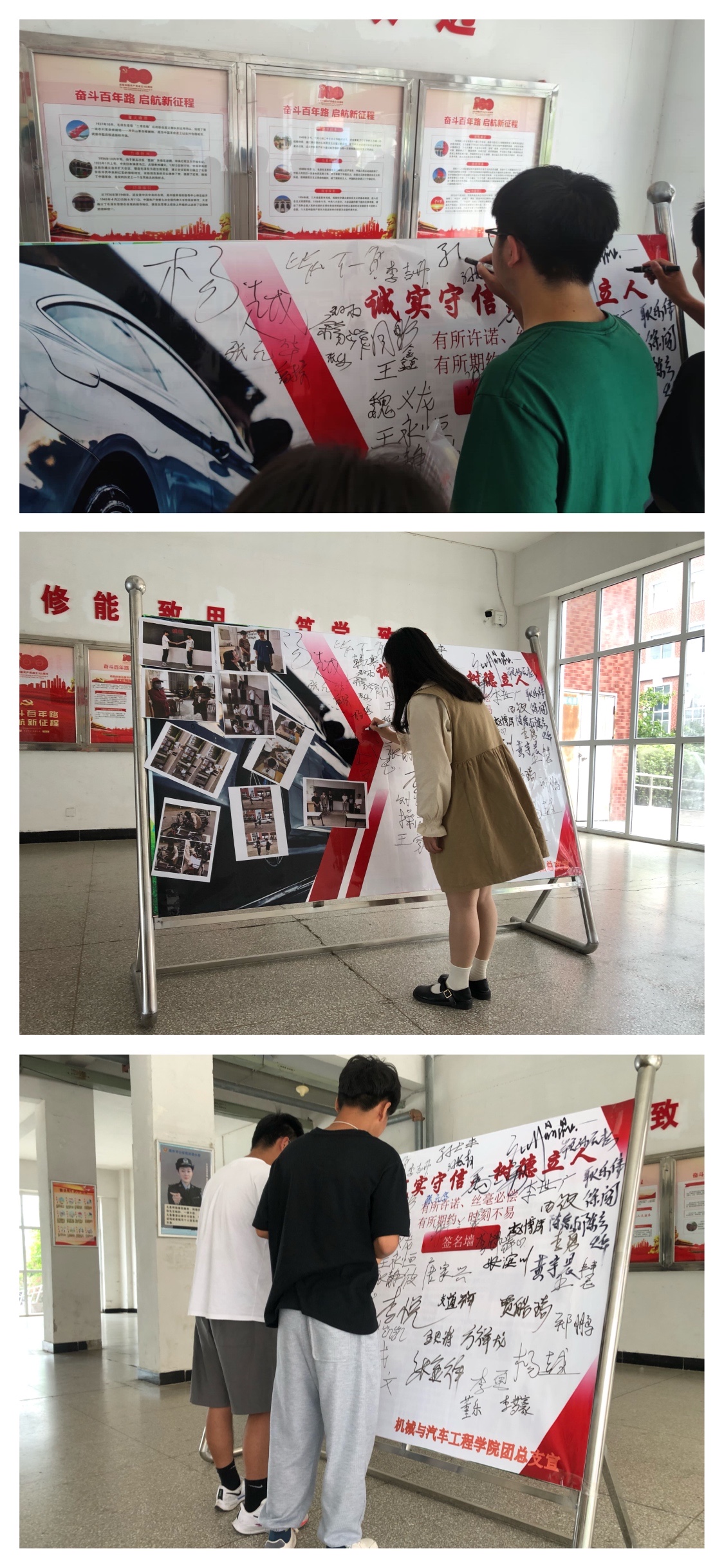 为进一步增强广大青年学生的诚信意识和责任意识,营造诚实守信的校园文化氛围,2022年5月27日,机械与汽车工程学院团总支在5号楼大厅开展里诚信签名与诚信图片展教育主题活动。