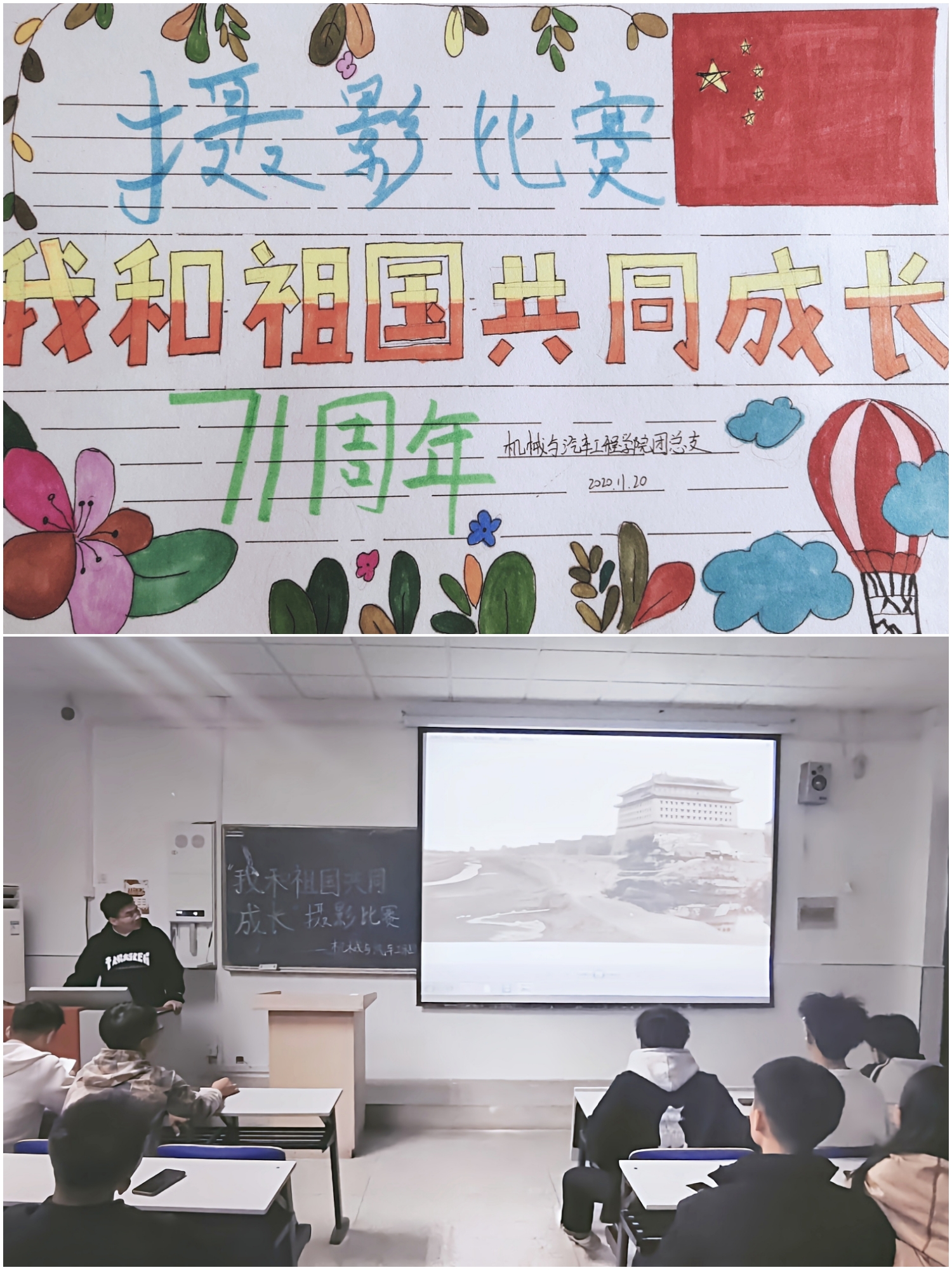 为庆祝新中国成立71周年,弘扬优秀传统文化。11月20日下午18时许,机械与汽车工程学院团总支在5113教室开展“我和祖国共成长”摄影比赛优秀作品展览活动。此次摄影比赛活动由卢宇航同学主持,并顺利结束。