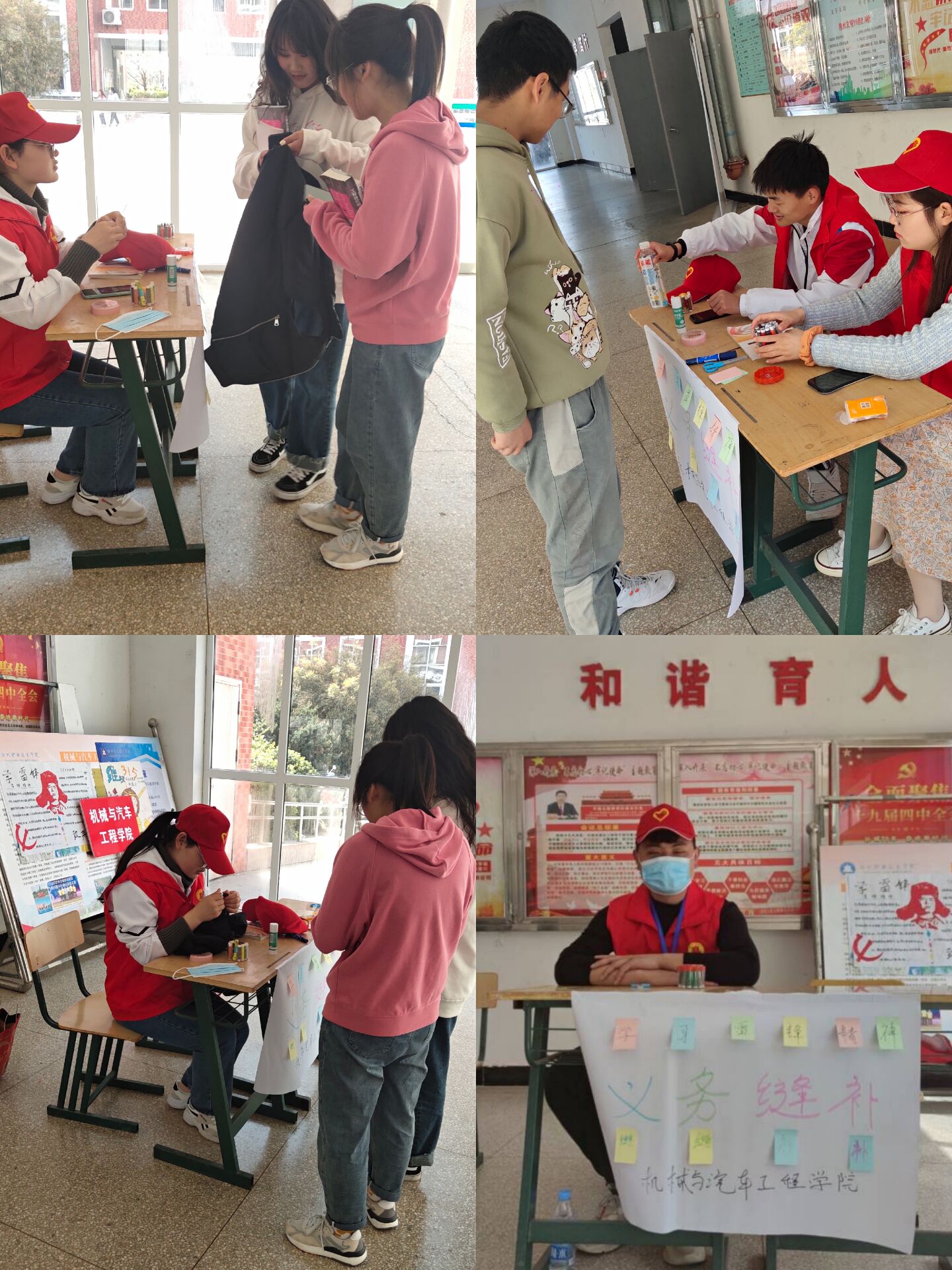 329日,机械与汽车工程学院学生会于5号教学楼一楼大厅,给过往上课的学生免费缝补衣服。学生会干事张祯、汪斯棋、徐磊、窦宇等四位同学担任裁缝,热情的服务前来缝补衣服的同学。