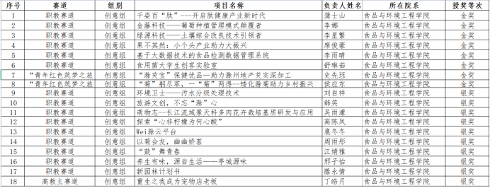 大赛启动以来,食环学院师生积极踊跃报名参赛,精心组织,对照方案内容,做到有重点、分类别、勤督促,在规定时间内圆满完成了220个参赛项目计划,共上传学生创新创业作品286份,完成率130%。教师精心指导学生对项目计划书进行认真打磨,不断提升项目参赛质量,经过专家评审,食环学院学子最终获得金奖8项、银奖10项的优异成绩。
