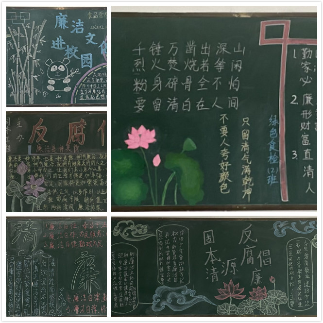 在辅导员的指导下,各班级紧扣主题,积极搜集相关资料,发挥同学们的写字、绘画特长,出制了一期主题明确、版面整洁、布局合理、图文并茂的“廉洁”主题板报。