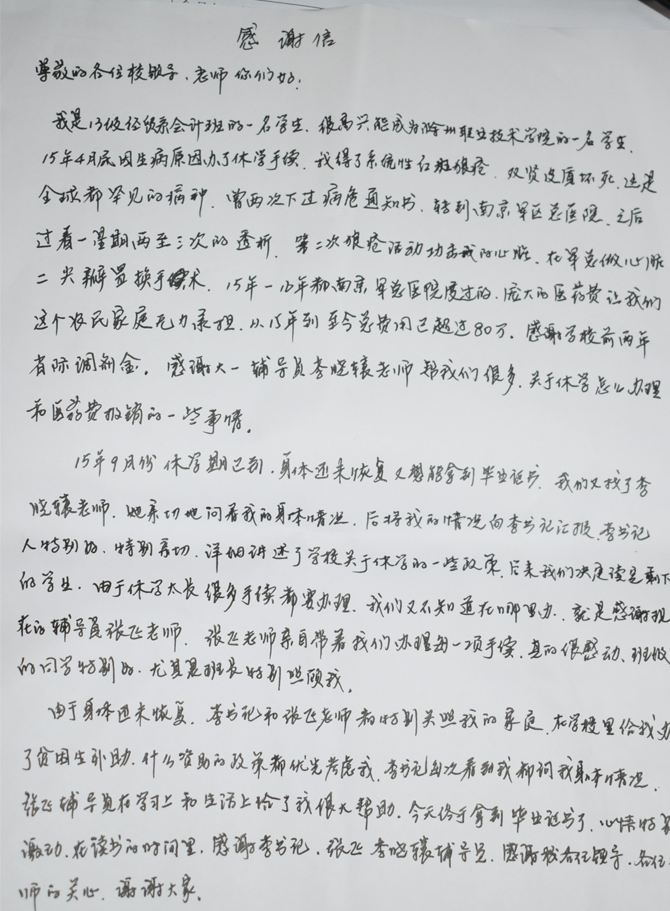 江洁一行先后深入天长市永丰镇和新街镇,看望新葡的京官网经贸系和土木系两名困难学生家庭。不管是病魔的无情折磨,还是亲人相继离去的悲恸,两名学生始终乐观坚毅。得知我们要来,饱受病痛折磨、浑身没有一丝力气的小王让父亲代写了一封长长的感谢,细数在校受到的关怀与帮助,字里行间流露出对学校的爱与感恩。她们灿烂的笑容与感恩的情怀深深触动了走访人员的心。