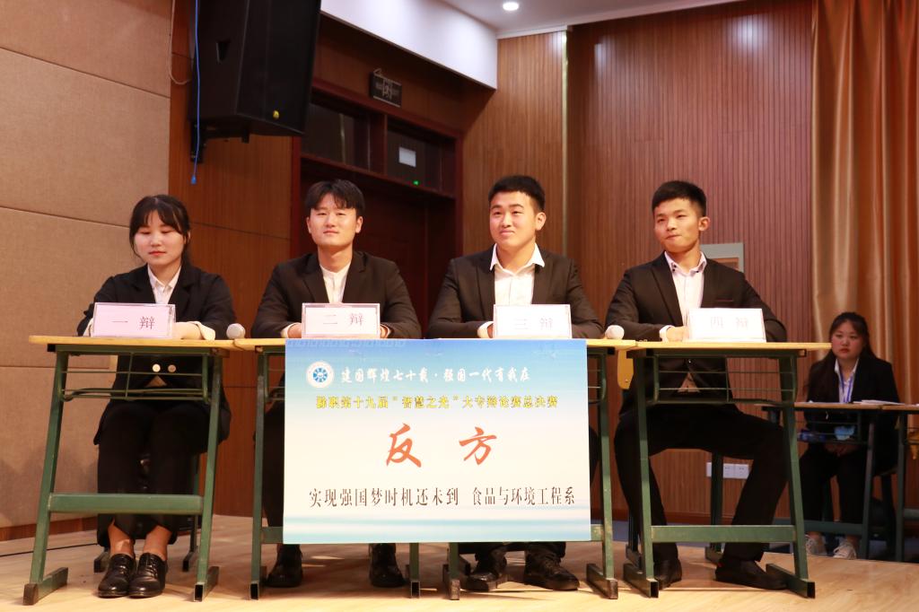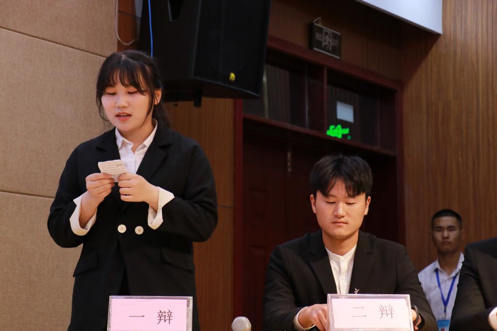 正反双方就“实现强国梦时机正当时(还未到)”展开激烈辩论。我方选手紧紧围绕“还未到”展开立论,思路清晰、引经据典,现场气氛火速升温。在一对一攻辩和自由辩论环节,我方选手表现出色,攻破一个个“难关”、识破一个个“陷阱”,展现了较强的思辨能力和团队协作能力。最终凭借队员们的优异表现,食环系系代表队比对方略胜一筹,以0.2分的微弱优势险胜对手,荣获本届辩论赛冠军,三辩杨俊财同学获得“最佳辩手”称号。