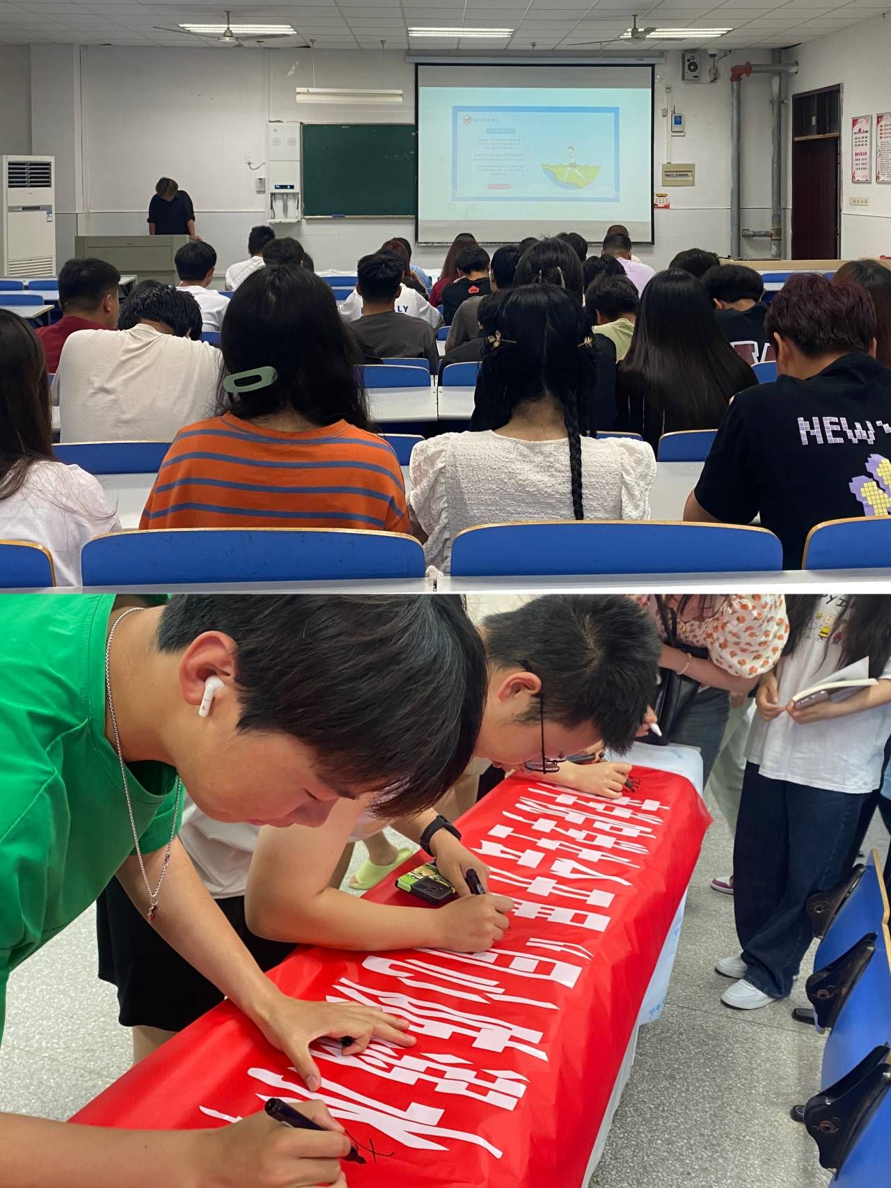 本次讲座通过PPT宣讲的方式,讲解了游泳安全注意事项、如何预防溺水以及溺水后如何实施自救。提醒同学们不仅在学校要牢记防溺水“六不准”,暑期回家也要远离水沟、池塘、河渠等无安全措施的水域。活动结束后,同学们在宣传防溺水的横幅上签字并合影留念。