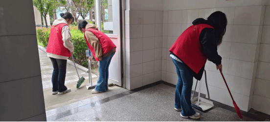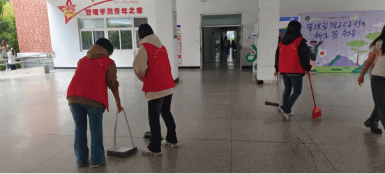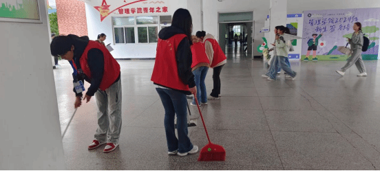 在为期一周的卫生清扫活动中,商学院学生会在1号楼致真楼大厅、入门口分别组织同学进行打扫,用自身的行动践行校园文明建设。