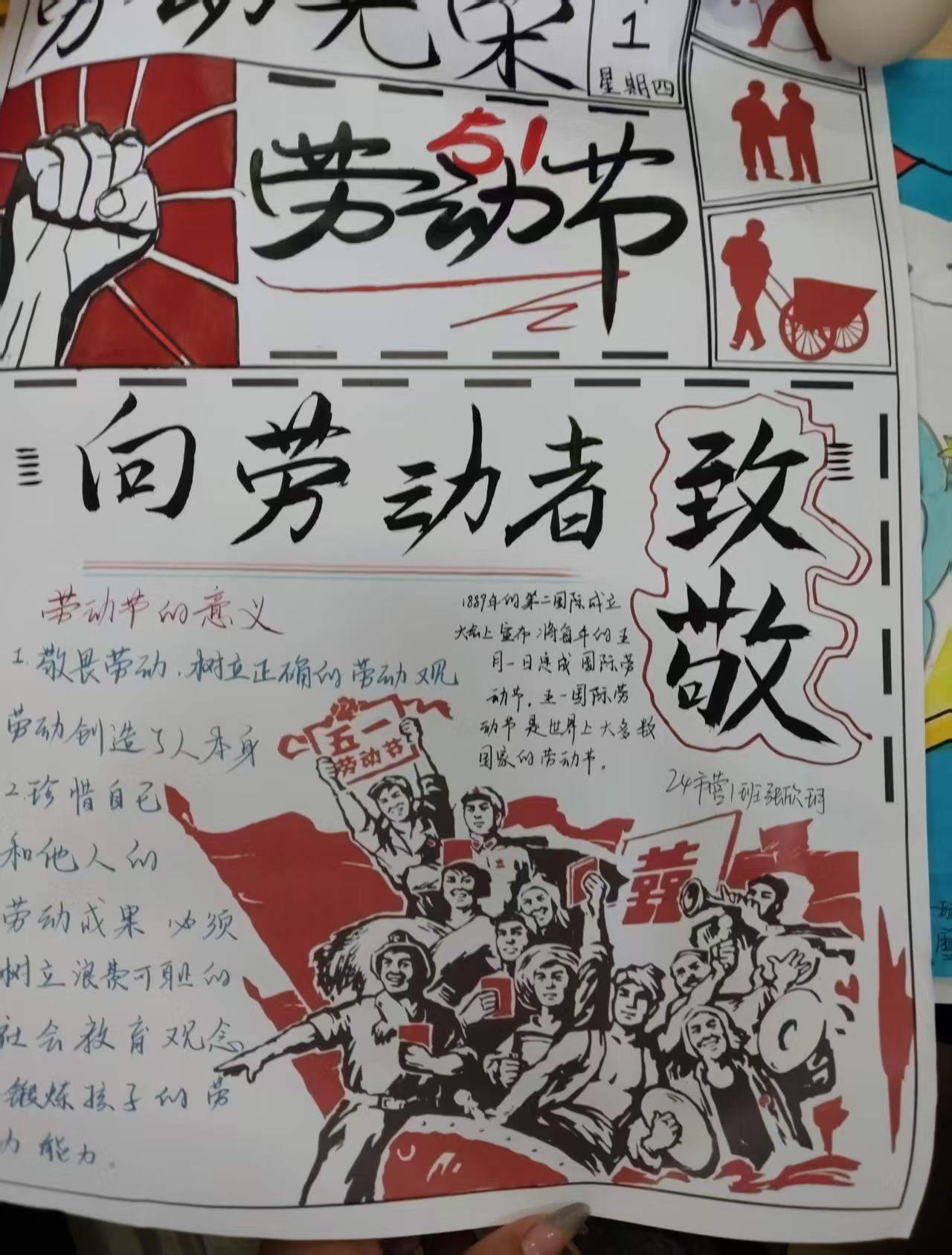 此次五一手抄报比赛不仅是一场艺术创作的比拼,更是一次深入心灵的劳动教育实践。同学们在构思与绘制中,将对劳动的敬意化作笔尖的线条与色彩,让“劳动最光荣”的理念从口号变为可触可感的艺术表达,愿每一位同学都能将劳动精神镌刻进成长的年轮,在未来的征途上,用双手绘就更美好的人生画卷,让劳动之光在青春的赛道上永远闪耀。