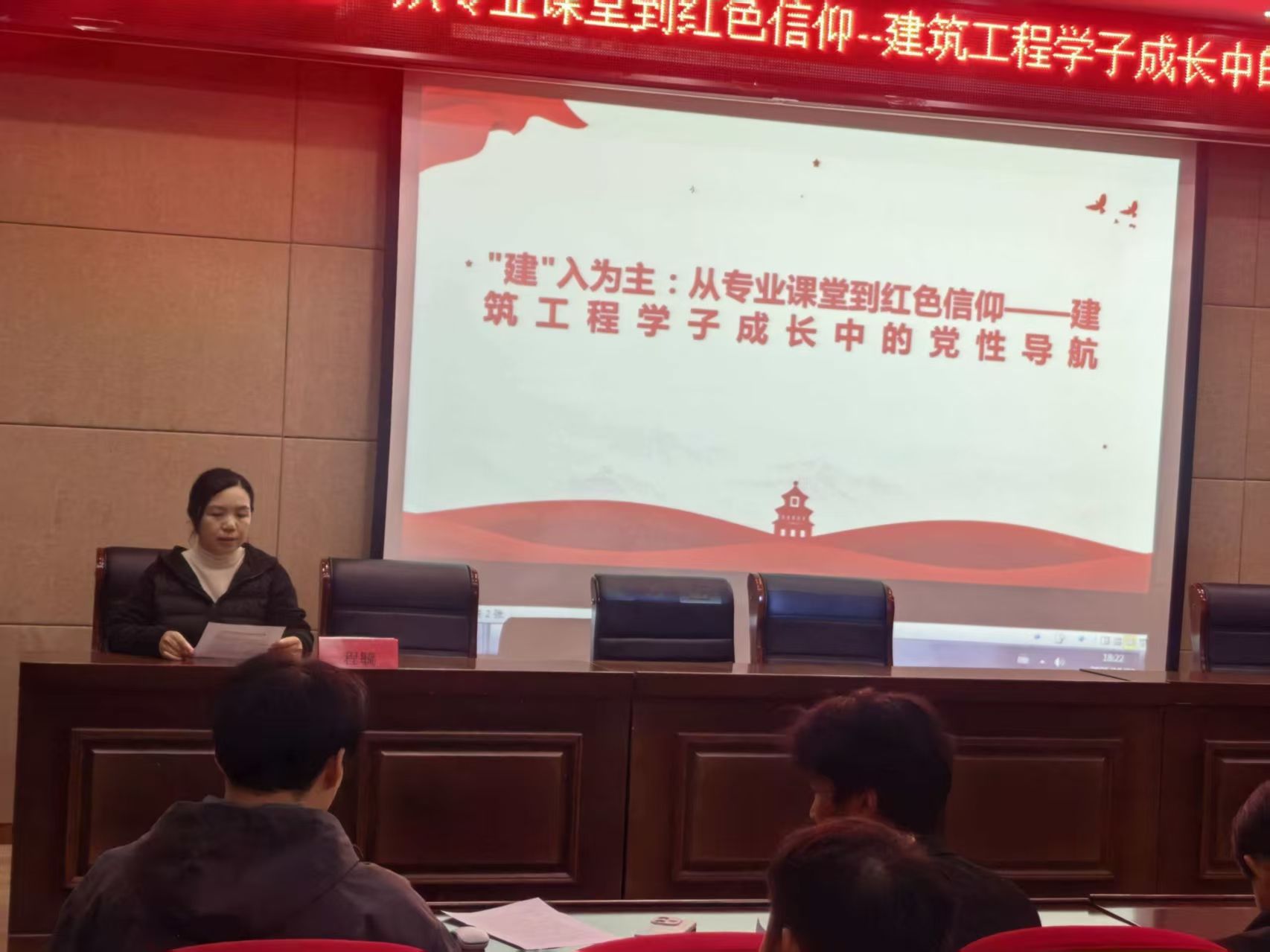 为深入学习贯彻习近平新时代中国特色社会主义思想,推动党建工作与专业教育深度融合,10月25日,建筑工程学院“专业+政治”双融党课系列活动(四)在学院南阶205教室举行。本期党课由学院党总支副书记程毓主讲,主题为《“建”入为主:从专业课堂到红色信仰——建筑工程学子成长中的党性导航》。