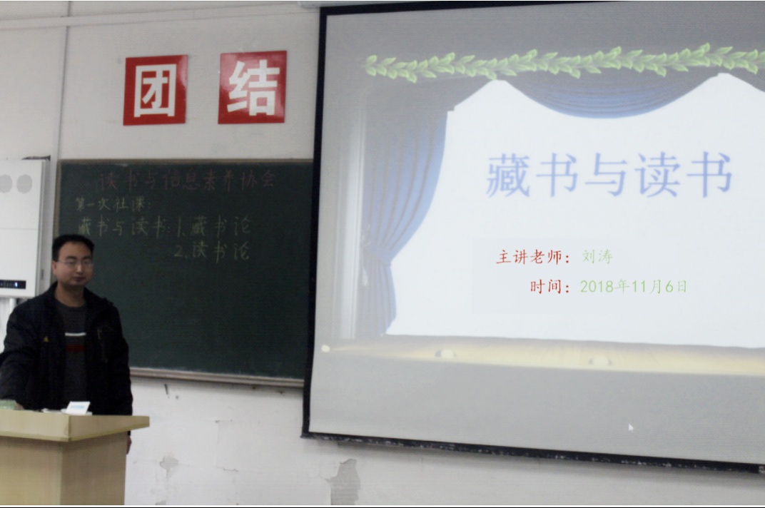 为了让同学们深入了解藏书与读书方面的知识,11月6日中午12点,读书与信息素养协会在致新楼5113教室举办了以“藏书与读书:藏书论和读书论”为主题的讲座。此次讲座由本协会指导老师刘涛主讲,读书协会干部、成员和社联的几名同学参加。