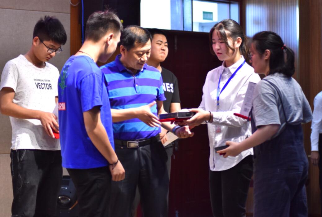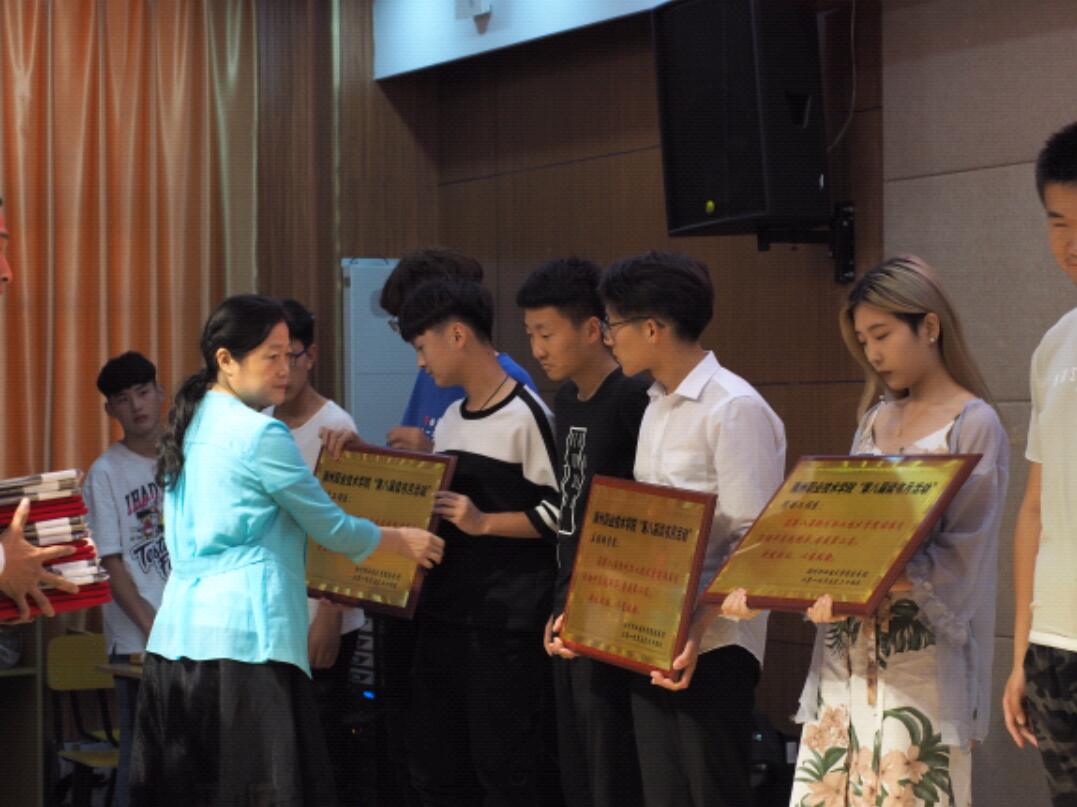 主持人朱潇建和王孟两位同学公布了获奖名单后,同学们依次上台领奖。图书馆馆长苏和堂、副馆长盛丽蓉、李艳老师和刘涛老师分别为获奖的各位同学颁发了奖状、荣誉证书和奖品。