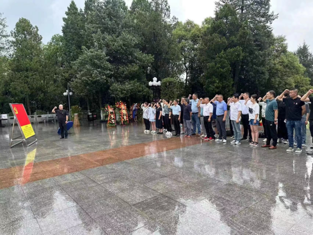 在金寨县革命烈士纪念塔前,党员们敬献花篮,胡凼带领党员集体重温入党誓词,并向长眠于此的革命先烈鞠躬致敬,表达深切怀念和崇高敬意。