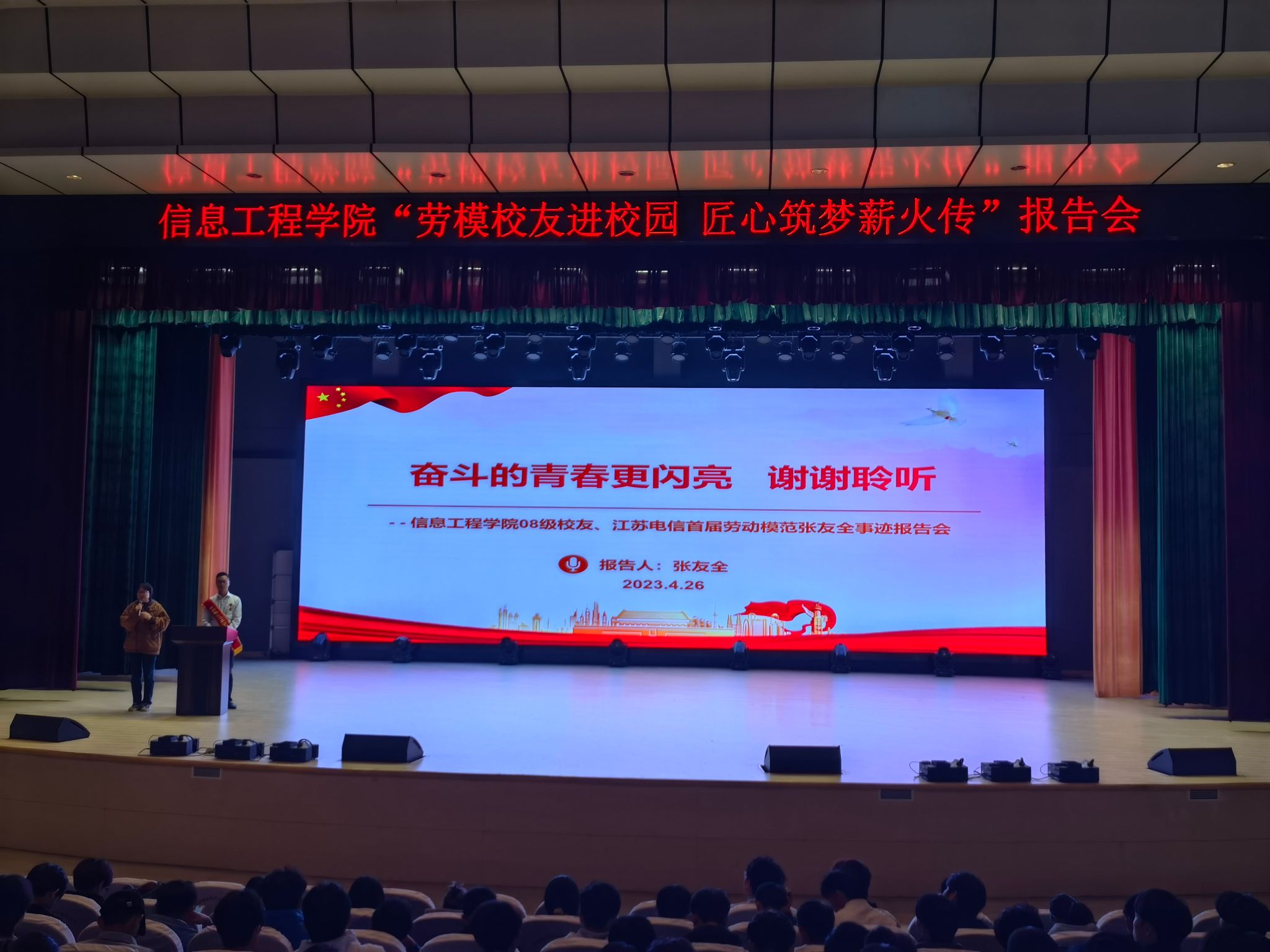 为了进一步弘扬传承劳模精神、劳动精神和工匠精神,教育引领新时代大学生树立正确的劳动观。4月26日下午,信息工程学院邀请了2011届优秀毕业生张友全给新葡的京官网学子带来了一场别开生面的报告会,报告主题为“劳模校友进校园 匠心筑梦薪火传”。出席此次报告会的有学生处副处长顾宏才、信息工程学院党总支副书记杨阳、22级全体辅导员和学生。
